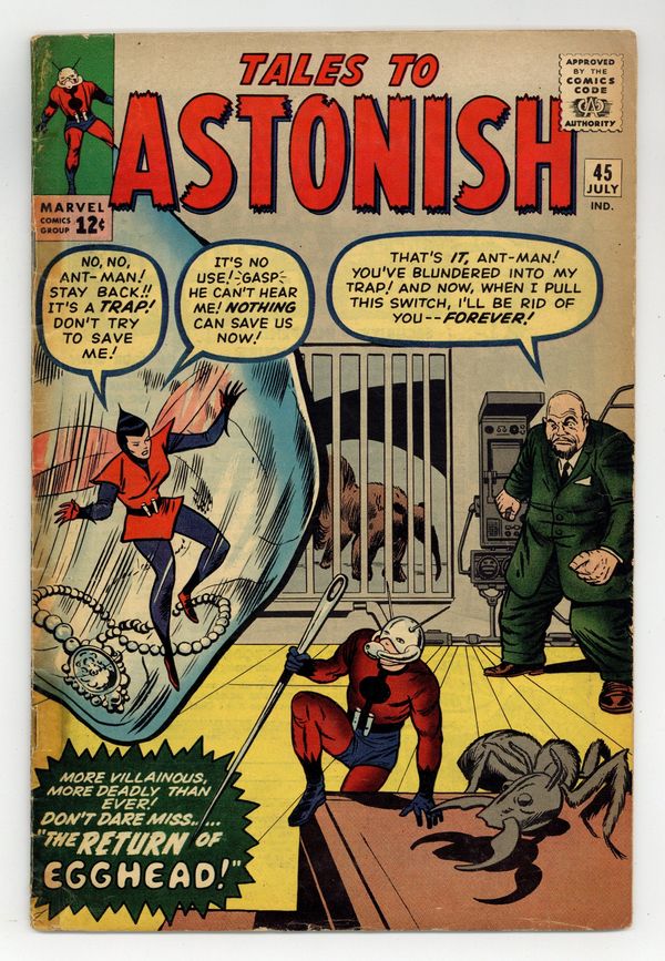 Cover by Jack Kirby and Dick Ayers. The Terrible Traps of Egghead!, script by Stan Lee and Ernie Hart [H. E. Huntley], art by Don Heck; Egghead forms a new gang and sets a trap for the Wasp, hoping to use her against Ant-Man. The Future text story. Bronson's Brain!, script by Stan Lee, art by Steve Ditko; Bronson, an incredible genius upset that no one on earth can match his tremendous intellect, builds a space ship and travels to a planet of highly advanced aliens. It Walks Like a Man!, script by Stan Lee and Robert Bernstein [as R. Berns], art by Paul Reinman; A man is disturbed by his daughter's attachment to her new robot playmate, but changes his mind when it saves her life. 36 pgs., full color. $0.12. Cover price $0.12.
