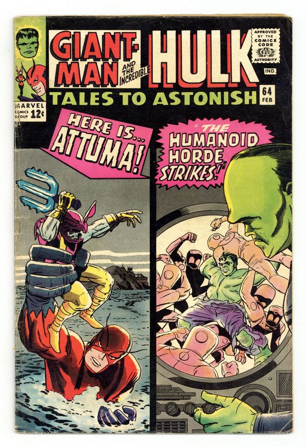 Cover by Jack Kirby and Dick Ayers. When Attuma Strikes!, script by Leon Lazarus, art by Carl Burgos and Paul Reinman; When Hank snaps at Jan for making a clumsy error during an experiment, she tearfully decides to get away from his abuse and take a trip; When her plane is captured in Attuma's latest bid for surface world conquest, a remorseful Giant-Man comes to the rescue. The Horde of Humanoids!, script by Stan Lee, art by Steve Ditko and George Roussos (as George Bell); Banner has been jailed as a traitor and is popping tranquilizers to keep himself from turning into the Hulk; Rick goes right to the commander in chief to tell the prez Banner's secret and to ask for his release; Much to Talbot's chagrin, the president orders Bruce's release and the two are sent to Astra Island to oversee testing of Banner's absorbatron which has the power to soak up a nuclear blast. 36 pgs., full color. $0.12. Cover price $0.12.