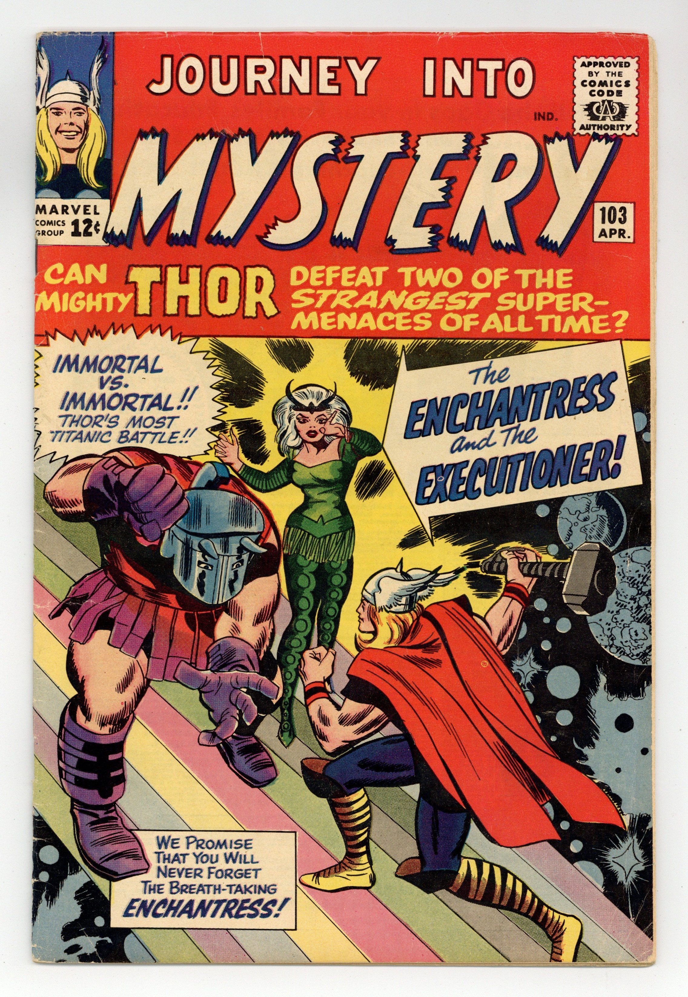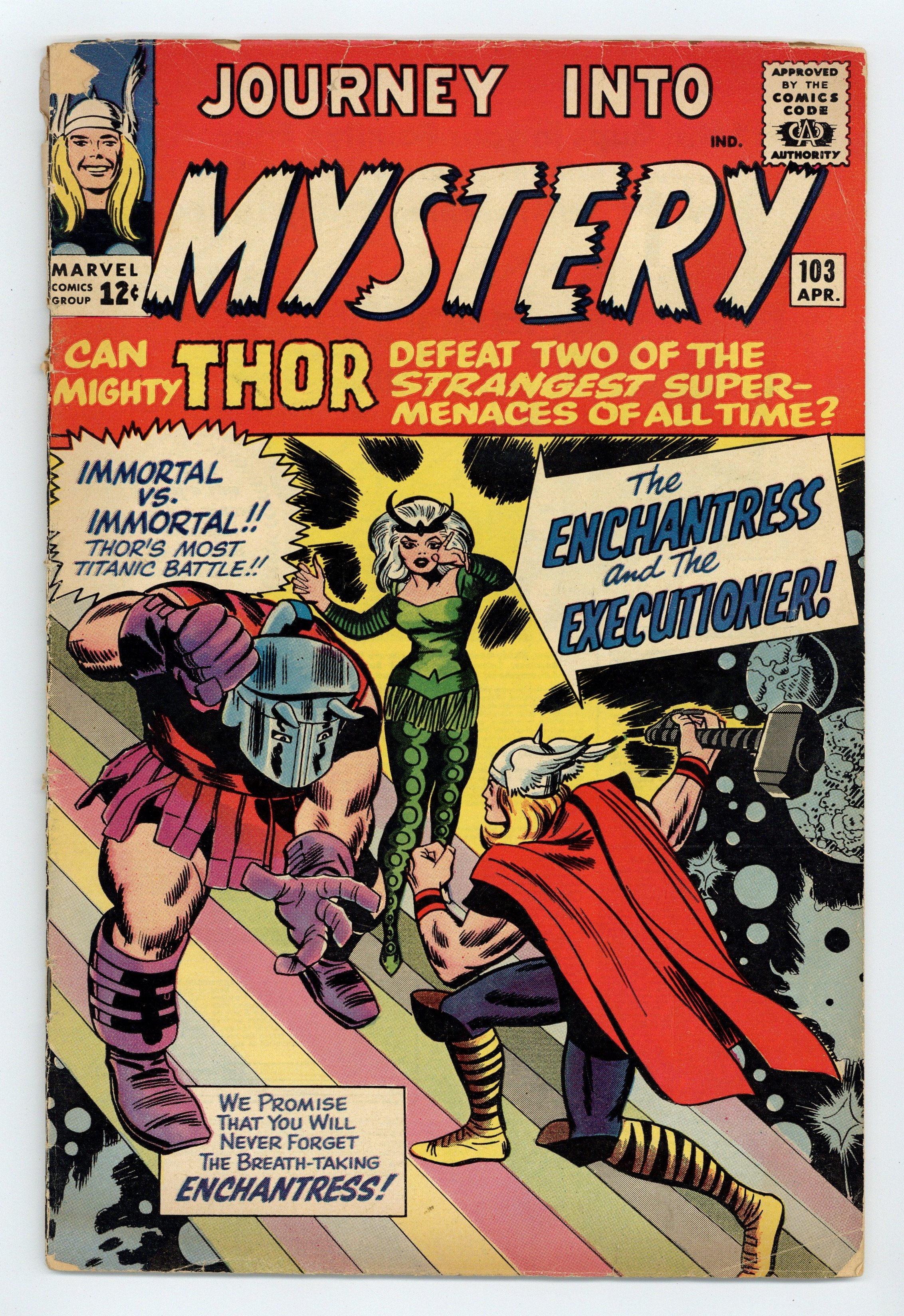 Cover pencils by Jack Kirby, inks by George Roussos. "The Enchantress and the Executioner!", script by Stan Lee, pencils by Jack Kirby, inks by Chic Stone; Loki and Odin conspire to end Thor's infatuation with Jane Foster by sending the Enchantress to seduce him away from his mortal love; The heavy handed Executioner fouls things up and the mission is unsuccessful; features the first appearance of the two title characters. "Poor Oscar" text story. "To Live Forever!", script by Stan Lee (plot) and Larry Lieber (script), pencils by Larry Lieber, inks by Chic Stone; In a future where capital punishment has been abolished, the maximum sentence is 90 years imprisonment; A brilliant scientist decides to find a way to make himself immortal, so he may commit crimes with impunity, but turns himself into a rock. This issue also has a statement of ownership: average print run 318,413; average paid circulation 187,740. "Thor's Mission to Mirmir!", script by Stan Lee, pencils by Jack Kirby, inks by Chic Stone; Thor must reach Mirmir to tell him that Odin has decided it is time to create the human race. 36 pgs., full color. Cover price $0.12.