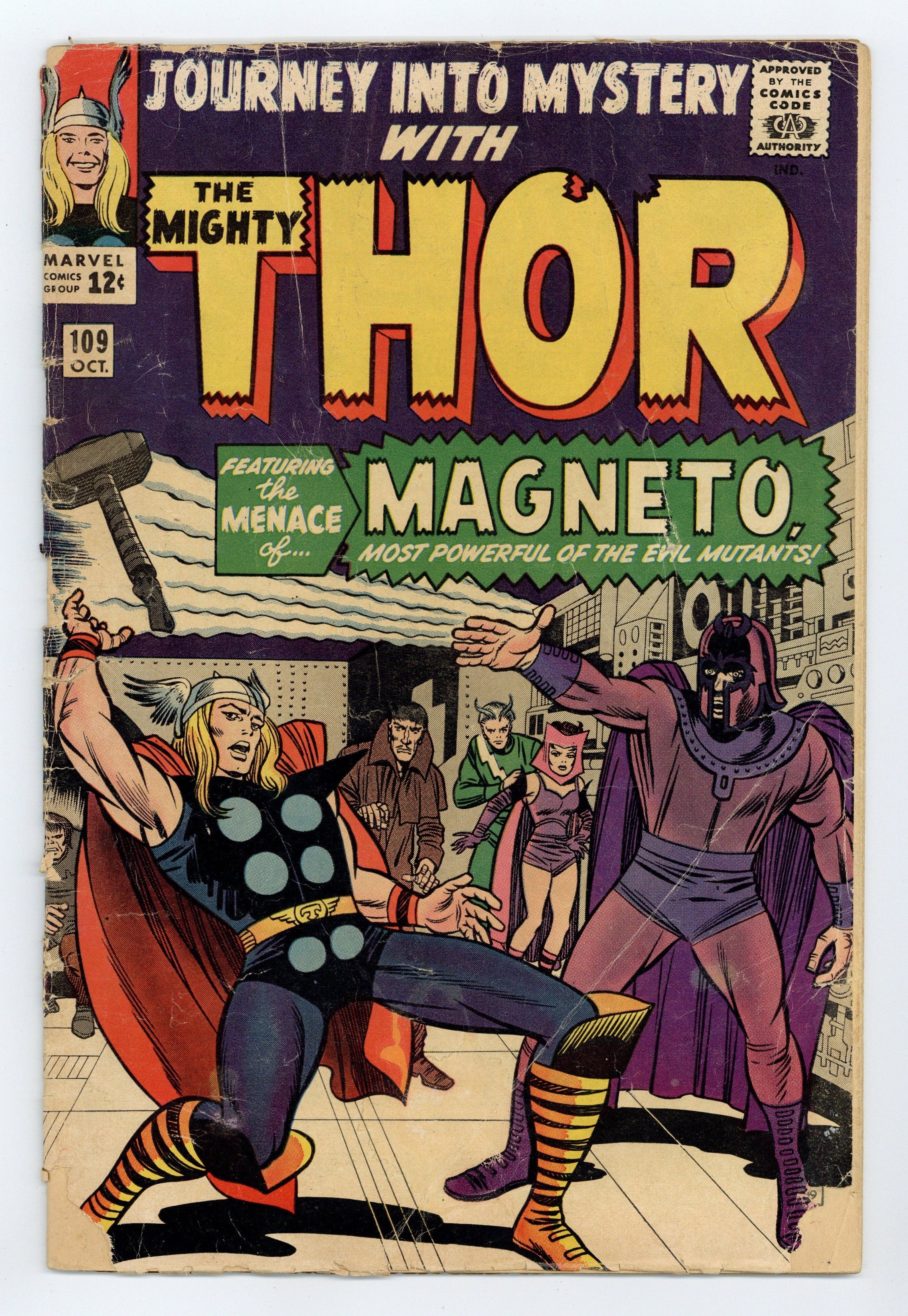 Cover pencils by Jack Kirby, inks by Chic Stone. Magneto takes a break from pestering the X-Men to battle Thor in "When Magneto Strikes!", script by Stan Lee, pencils by Jack Kirby, ink by Chic Stone; Magneto is testing his powers in the city; He "attracts" Thor's attention; They battle aboard Magneto's submarine; Meanwhile, the Brotherhood of Evil Mutants are out looking for the X-Men. Magneto flees from Thor in his escape vessel and the X-Men's submarine is seen pursuing him; Thor turns back to Don Blake and visits Jane Foster. She makes him a snack and gives him a glass of milk; Guest appearances by Quicksilver, the Scarlet Witch, Mastermind, the Toad, and Jane Foster; Cameos by Captain America, Iron Man, the Thing, Mr. Fantastic, and the Invisible Girl. "Tales of Asgard" back-up, "Banished From Asgard!", script by Stan Lee, pencils by Jack Kirby, inks by Vince Colletta; Arkin the Weak betrays Asgard in an attempt to win the hand of Queen Knorda. First letters page. 36 pgs., full color. Cover price $0.12.