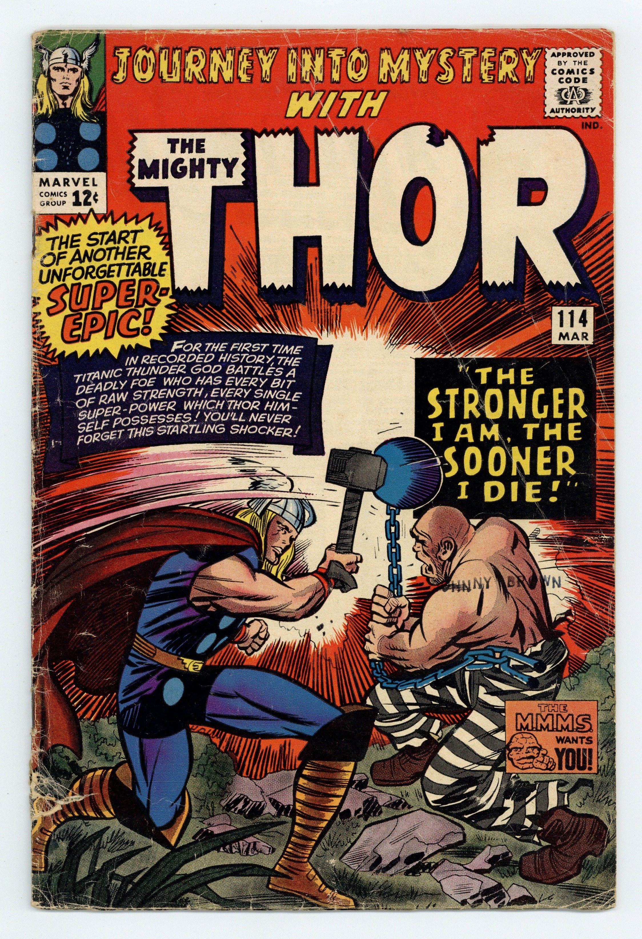 Tags: Marvel Legacy Numbering: Thor (part 114), Thor$59.00Cover pencils by Jack Kirby, inks by Chic Stone. First appearance and origin of the Absorbing Man in "The Stronger I Am, the Sooner I Die!" (And what a great title!), script by Stan Lee, pencils by Jack Kirby, inks by Chic Stone; Loki uses his magic to turn Crusher Creel into the Absorbing Man; A patient of Blake's, reporter Harris Hobbs, alerts him the existence of the Absorbing Man; Blake breaks a dinner date with Jane in order to investigate as Thor; Thor and Creel meet and fight; Hobbs witnesses the battle and is injured; Thor tends to Hobbs before resuming his battle; Balder then interrupts the fight by transporting Thor to Asgard; It seems that Loki has abducted Jane and brought her to the Golden Realm; Thor and Balder ride off to save her; Appearance by Loki. Fantastic Four comic ad. "Tales of Asgard" back-up, "The Golden Apples!", script by Stan Lee, pencils by Jack Kirby, inks by Vince Colletta; Asgardian version of Little Red Riding Hood; First appearance of the land of Varinheim. 36 pgs., full color. Cover price $0.12.