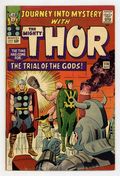 Starts Apr 27 Cover pencils by Jack Kirby, inks by Vince Colletta. "The Trial of the Gods!", script by Stan Lee, pencils by Jack Kirby and Carl Hubbell, inks by Vince Colletta and Carl Hubbell; Odin sends Thor and Loki to Skornheim to endure the Trial of the Gods which will show which one of his sons is lying to him; Against Odin's decree, Loki uses magic to escape the traps of the enchanted land while Thor has to rely on brawn and sheer will; Meanwhile, the Enchantress and the Executioner set about tormenting Jane Foster in a bid to influence the outcome of the trial; Odin sends Balder to deal with them; Guest appearances by the Avengers (Captain America, Iron Man, Giant-Man, and the Wasp), Rick Jones, the Teen Brigade, the Enchantress, and Executioner; There is a minor plot crossover with Fantastic Four 38; Cameos by Daredevil, Medusa, Trapster, Sandman, and the Wizard. "Tales of Asgard" back-up, "The Challenge!", script by Stan Lee, pencils by Jack Kirby, inks by Vince Colletta; On a diplomatic mission, Loki convinces King Hymir to put Thor to a deadly test where failure means slavery to the evil king; Thor, of course, passes the test, much to the annoyance of Hymir who strikes Loki and accuses him of betrayal; First appearance of Princess Rinda and King Hymir. 36 pgs., full color. Cover price $0.12.