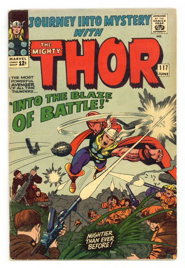 Cover pencils by Jack Kirby, inks by Vince Colletta. "Into the Blaze of Battle!", script by Stan Lee, pencils by Jack Kirby and Carl Hubbell, inks by Vince Colletta and Carl Hubbell; Loki wins the Trial of the Gods through deceit and trickery; He broke the rules by using enchanted Norn Stones, which he now discards through a dimensional portal; Odin gives Thor 24 hours to prove Loki's dishonesty; On Earth, Balder has been battling the Enchantress and the Executioner who were tormenting Jane Foster; Thor arrives and the two villains flee; Thor flies to Vietnam in search of the Norn Stones; There he becomes involved in that country's war; Appearance by Karnilla. "Tales of Asgard" back-up: "The Sword in the Scabbard!", script by Stan Lee, pencils by Jack Kirby, inks by Vince Colletta; The warriors of Asgard are bored and Loki has been able to stir up trouble among their ranks; Odin is furious and intervenes when Thor and Loki face each other in combat. Odin then shows them the state of the Odinsword; According to legend, the universe will perish if the sword is ever drawn from its scabbard; Now, an evil force has broken the scabbard; Odin sends his sons on a quest to find this unknown enemy and put an end to this evil scheme. 36 pgs., full color. Cover price $0.12.