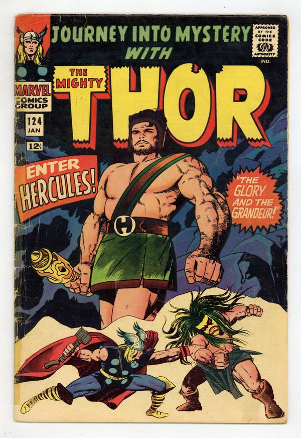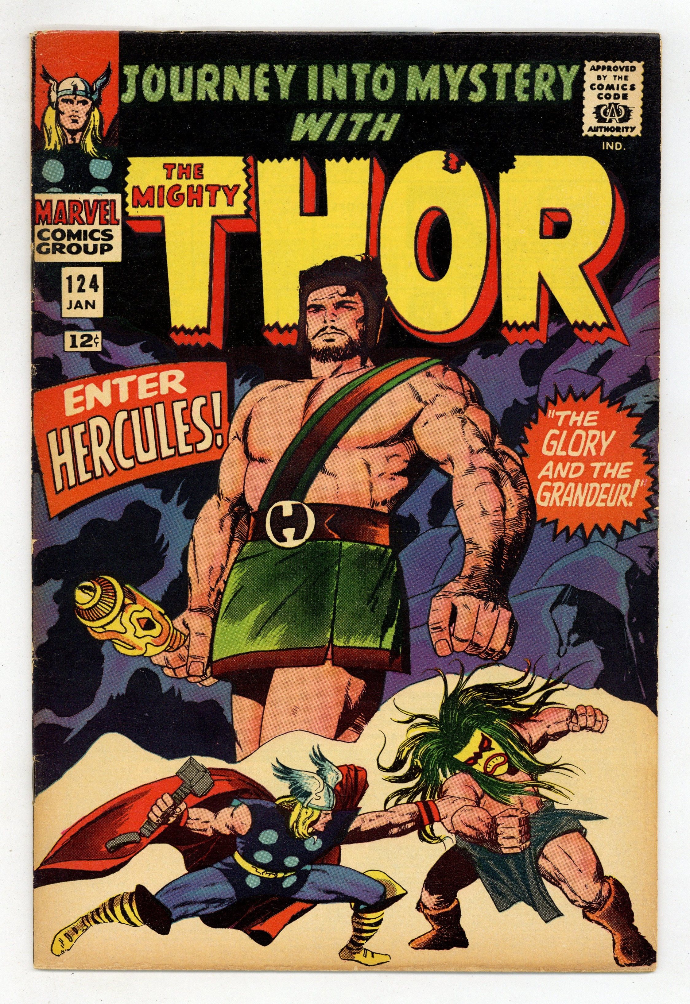 Cover pencils by Jack Kirby, inks by Vince Colletta. First appearance of Atlas in "The Grandeur and the Glory!", script by Stan Lee, pencils by Jack Kirby, inks by Vince Colletta; Thor learns of a "demon" terrorizing the jungles of Asia; Donald Blake reveals his secret to Jane, infuriating Odin; And, Zeus dispatches Hercules to Earth to deal with the native turned "Demon." Tale of Asgard: "Closer Comes the Swarm!", script by Stan Lee, pencils by Jack Kirby, inks by Vince Colletta; While the Asgardians are licking their wounds after a battle with a dragon, Queen Ula sends out the Flying Trolls of Thryheim to finish them off. Appearances by Balder, Hogun, Fandral, and Volstagg. 36 pgs., full color. $0.12. Cover price $0.12.