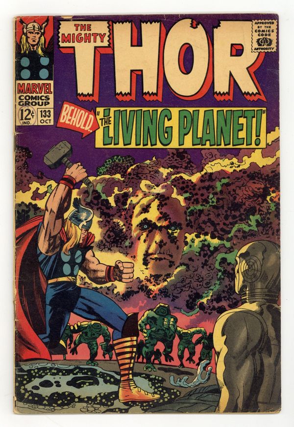 Tags: Marvel Legacy Numbering: Thor (part 133), Thor$17.00Cover pencils by Jack Kirby, inks by Vince Colletta. Ego and the Recorder guest star in "Behold...The Living Planet!", script by Stan Lee, pencils by Jack Kirby, inks by Vince Colletta; Thor wins over Ego, the Living Planet and gets Earth's freedom from the colonizers; Jane wanders into the New Men and is offered a job as a teacher in Wundagore. Bullpen Bulletins. Tale of Asgard: "Valhalla!", script by Stan Lee, pencils by Jack Kirby, inks by Vince Colletta; Harokin rides the Black Stallion of Doom to Valhalla. 36 pgs., full color. $0.12. Cover price $0.12.