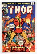 $50.00Cover by John Buscema. First appearance of Firelord in "The Coming of the Firelord!", script by Gerry Conway, pencils by John Buscema, inks by Joe Sinnott; Thor commands Mjolnir to return to him, and so it must; Hercules returns with the body of Holmes, and in drawing close, the spirit returns to his body; While Thor changes back to Blake to check on Krista, Firelord arrives on Earth, and at the selfsame hospital; Hercules and Firelord begin to battle, and Blake's cane is knocked out a window; Blake races to the ground and changes to Thor, and then he stops the battle, realizing who Firelord is - herald to Galactus; Firelord then summons Galactus, and Galactus plans to feast this day. The letters page contains Marvel Value Stamp #17 (Black Bolt by Jack Kirby). Bullpen Bulletins. 36 pgs., full color. $0.25. Cover price $0.25.