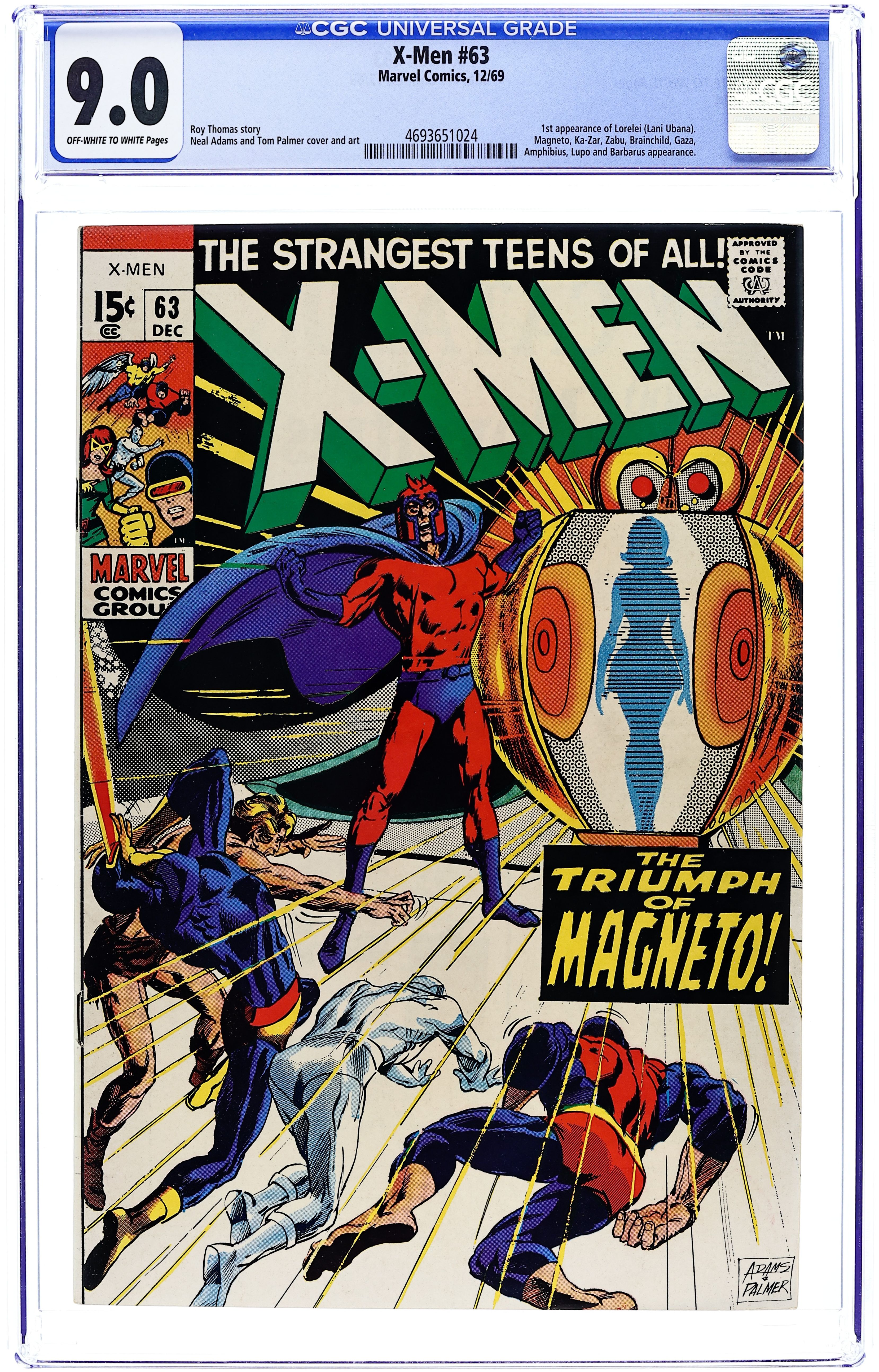 1st printing. Cover pencils by Neal Adams, inks by Tom Palmer. War in the World Below!, script by Roy Thomas, pencils by Neal Adams, inks by Tom Palmer; The X-Men and Ka-Zar battle Magneto and his manufactured mutants in the Savage Land. 36 pgs. $0.15. NOTE: 1994 JC Penney reprint exists. Can be identified by having a Stridex ad on the back cover. Cover price $0.15.