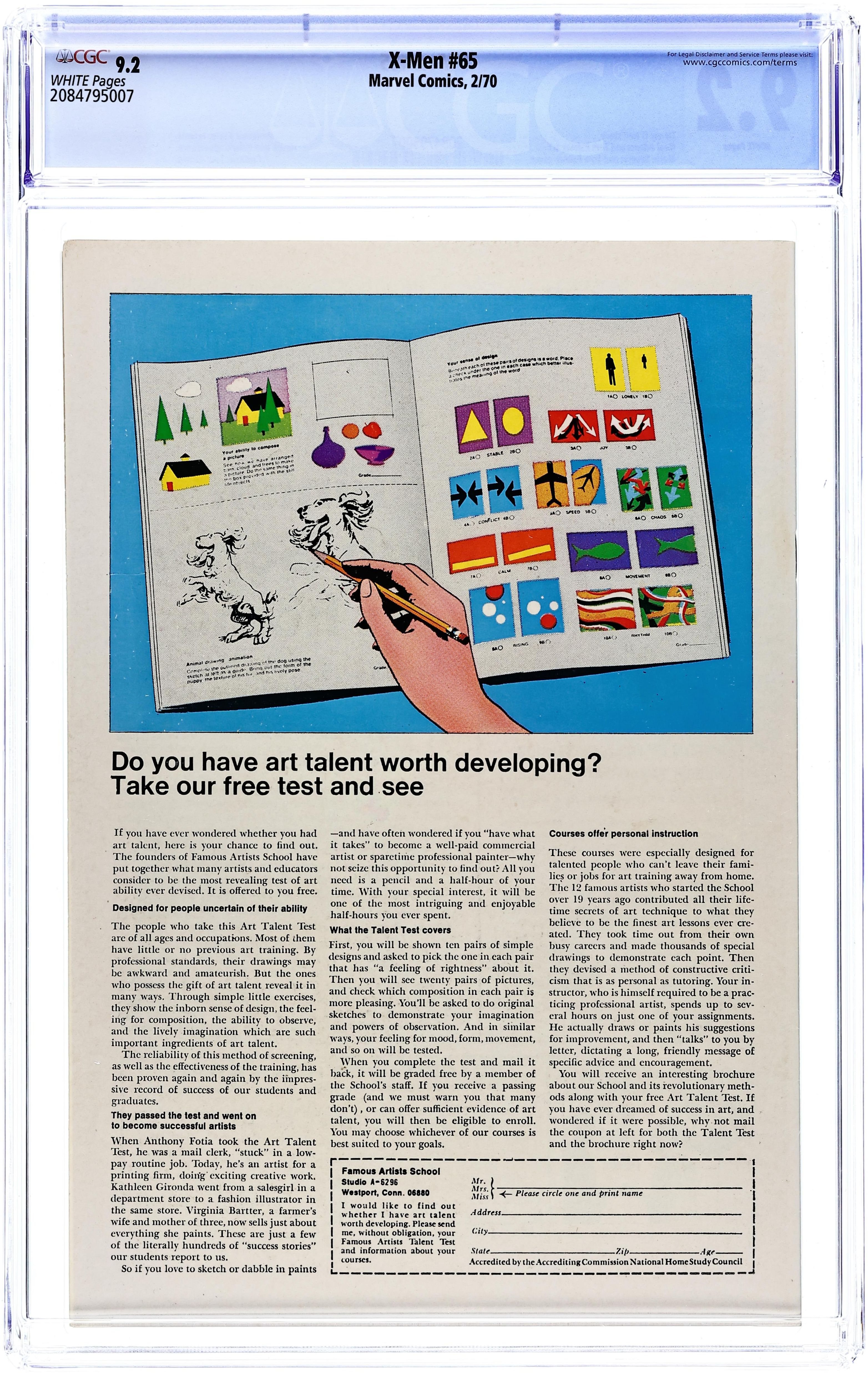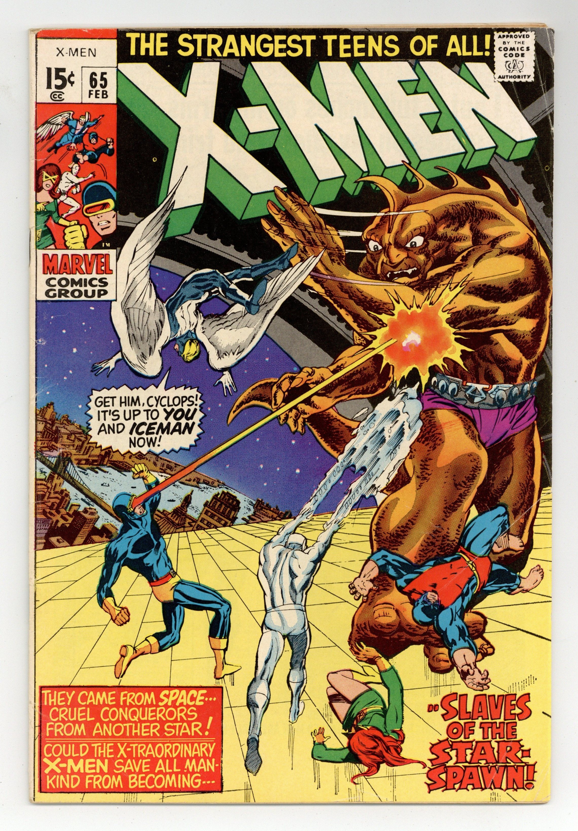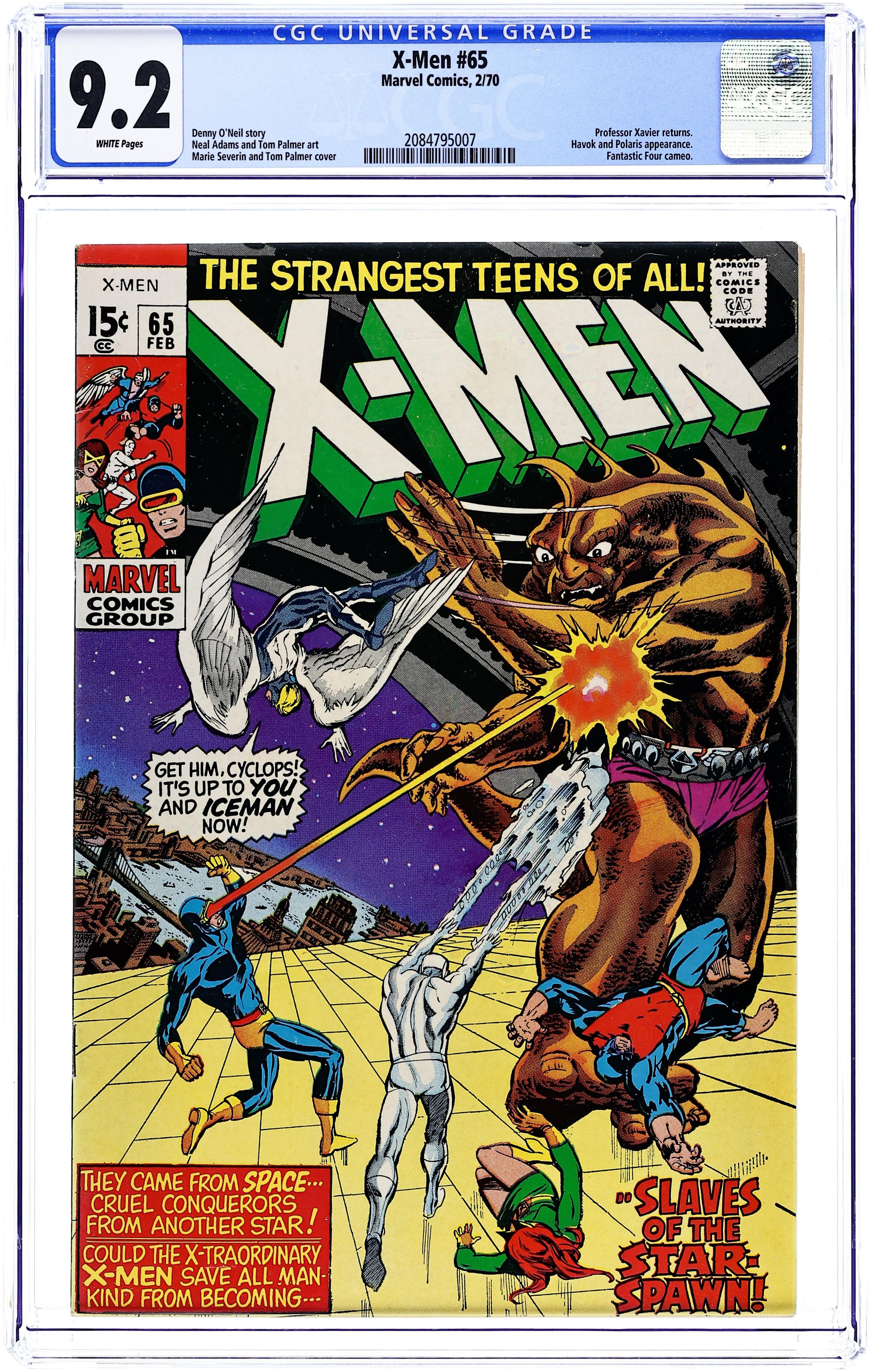 Cover pencils by Marie Severin, inks by Tom Palmer. Before I'd Be Slave..., script by Denny O'Neil, pencils by Neal Adams, inks by Tom Palmer; The X-Men make it back to the mansion after their harrowing battle with Magneto only to be commanded inside by Alex and Lorna; They learn that earth is about to be attacked by the alien Z'Nox but a plan has been made to counter the invasion--a plan formulated by none other than the "dead" Professor X; Xavier returns to his charges and explains that Changeling was masquerading as him when he was killed; The X-Men board the Z'Nox space ship and attack but it is the collective power of happy thoughts funneled through Xavier into his students that ultimately drives the aliens off. Letter from comics professional Doug Moench. 36 pgs. $0.15. Cover price $0.15.