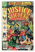 Tags: Justice League/Society$22.00Cover pencils by Al Milgrom, inks by Jack Abel. United We Fall! starring the Justice Society of America, script by Paul Levitz, pencils by Joe Staton, inks by Bob Layton; The JSA is divided against itself with one group -- consisting of Hawkman, Green Lantern, Flash, Star Spangled Kid, Wildcat, Dr. Fate -- facing off against a group with Commissioner Bruce Wayne behind them -- Robin, Wonder Woman, Starman, Dr. Mid-Nite, Hourman -- seeking to arrest the others on trumped up charges; Though Power Girl is hurt, Superman and Dr. Fate save the day when Superman stops the fight and Fate reveals that Commissioner Wayne is being controlled by the Psycho Pirate. The Ice Age Hostess ad with Aquaman, pencils by Curt Swan, inks by Vince Colletta. Two-page CBS Saturday morning cartoon ad with art by Neal Adams. Note : First appearance of second Huntress (Helena Wayne). This is shared by DC Super Stars (1976) #17 as they came out on the same day. 36 Pages, Full Color. Cover price $0.35.