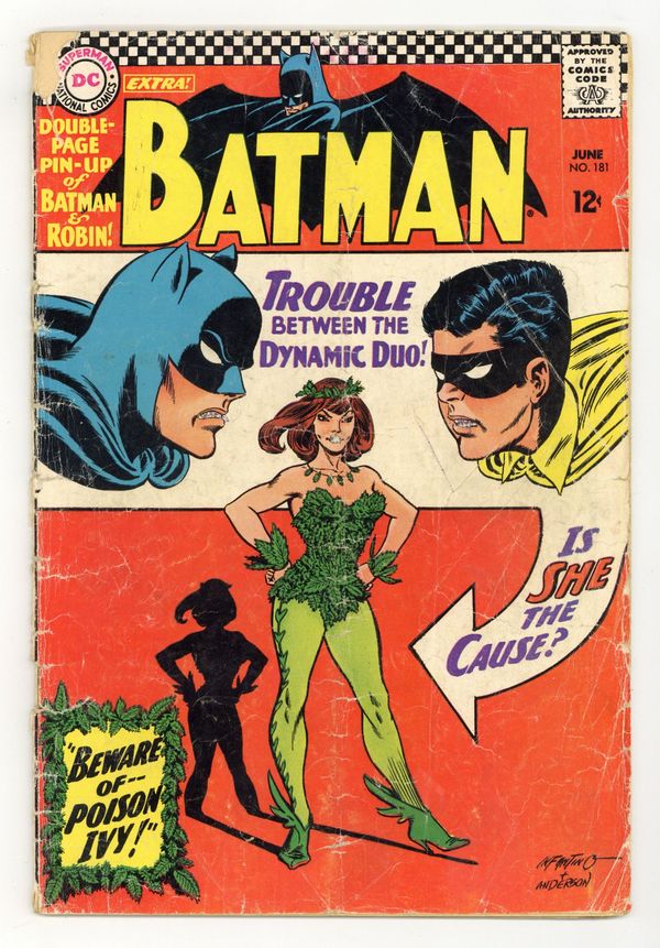 The 1st appearance of Poison Ivy. Cover pencils by Carmine Infantino, inks by Murphy Anderson. "Beware of--Poison Ivy!", script by Robert Kanigher, pencils by Sheldon Moldoff (as Bob Kane), inks by Joe Giella; While Bruce and Dick are attending an art show, a woman shows up, claiming to be the greatest criminal of those currently residing in Gotham. Centerspread is a great two-page color poster of Batman and Robin, pencils by Carmine Infantino, inks by Murphy Anderson. "The Perfect Crime--Slightly Imperfect!", script by Gardner Fox, inks by Sid Greene; At the latest meeting of the Anaylists, Kaye announces that she didn't write her latest book, and seems to be threatened by a voice from her brooch; Batman has a feeling that the Kaye at the meeting is an imposter, so he looks into the matter. Letter from future comics writer Mike Friedrich. Rocky and Bullwinkle star in a one-page Cheerios ad. 36 Pages, Full Color. Cover price $0.12.