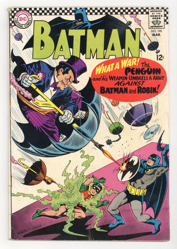 Starts Apr 4 Cover pencils by Carmine Infantino, inks by Joe Giella. "The Penguin Takes a Flyer--Into the Future!", script by Gardner Fox, pencils by Sheldon Moldoff (as Bob Kane), inks by Joe Giella; Penguin attempts to fool the Caped Crusaders into believing that his new tricks are based on futuristic technology. When this fails and his gang is captured the Fowl villain begins using robotic umbrellas against the Dynamic Duo. Letters from letter hack Guy H. Lillian III and Marvel colorist and assistant editor Irene Vartanoff. Cap's Hobby Hints activity half-page by Henry Boltinoff. Countdown on Excellence public service, script by Jack Schiff, art by Sheldon Moldoff; Jerry gets a lecture from his father on the importance of doing every job right. 36 Pages, Full Color. Cover price $0.25.
