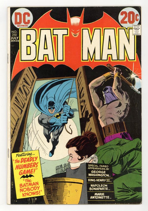 Tags: Batman$57.00Cover by Dick Giordano. "The Deadly Numbers Game!", script by Frank Robbins, pencils by Irv Novick, inks by Dick Giordano; Batman investigates a strange series of thefts based upon number-associated objects that end up in the hands of wax dummies in a museum; Batman confronts the man responsible for the thefts and learns that the young man has been trying to improve the ticket sales of the museum. "Return of the Flying Grayson!", script by Elliot S! Maggin, pencils by Irv Novick, inks by Frank McLaughlin; Robin tracks down some stolen paintings, one of which is of his parents doing their circus act. "The Batman Nobody Knows!", script by Frank Robbins, art by Dick Giordano; Bruce Wayne takes a group of children on a camping trip and learns what they think of Batman; After listening to their stories, Bruce surprises them by appearing as Batman. Letters from comics writers Bob Rozakis and Mike W. Barr. 36 Pages, Full Color. Cover price $0.20.