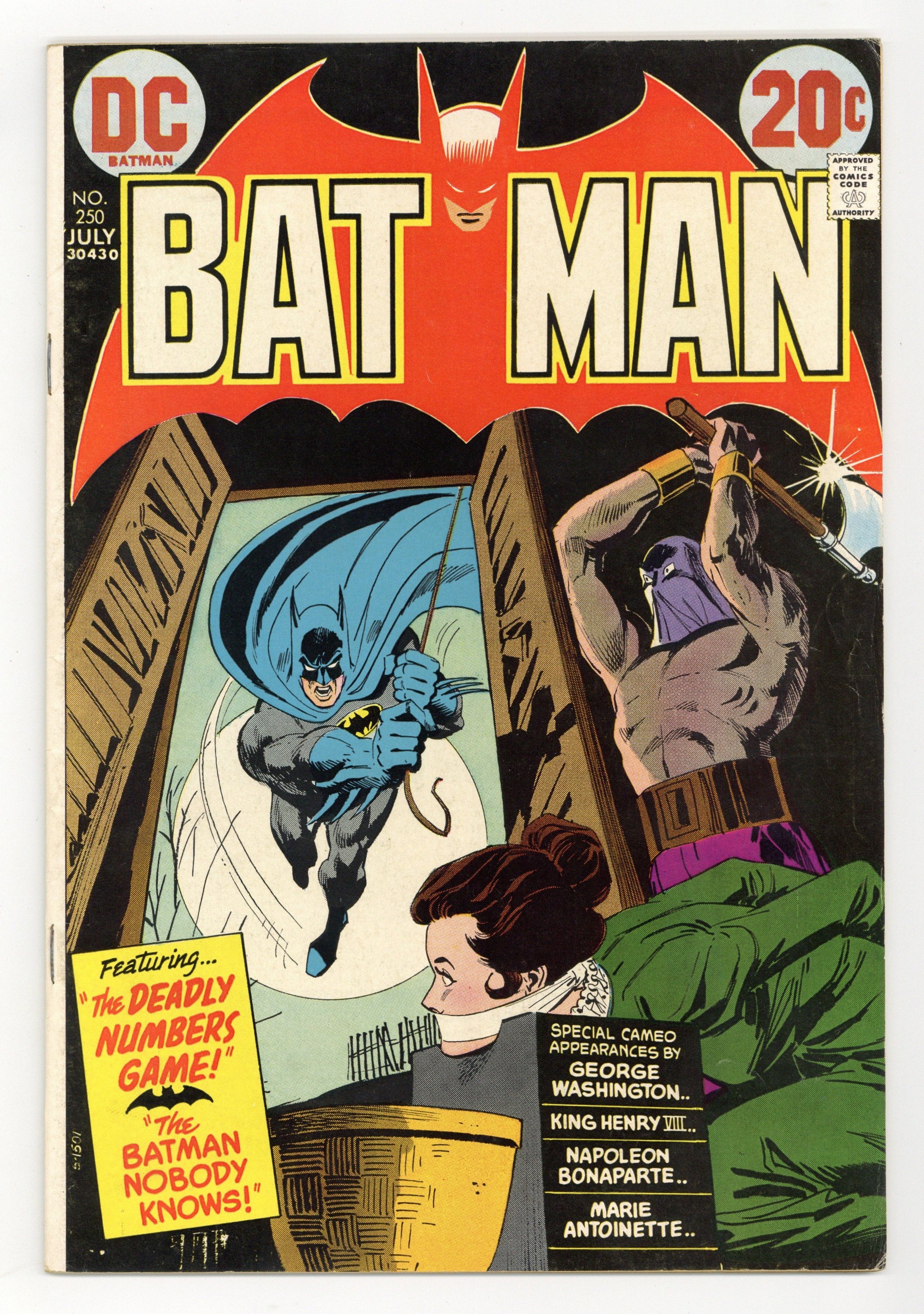 Cover by Dick Giordano. "The Deadly Numbers Game!", script by Frank Robbins, pencils by Irv Novick, inks by Dick Giordano; Batman investigates a strange series of thefts based upon number-associated objects that end up in the hands of wax dummies in a museum; Batman confronts the man responsible for the thefts and learns that the young man has been trying to improve the ticket sales of the museum. "Return of the Flying Grayson!", script by Elliot S! Maggin, pencils by Irv Novick, inks by Frank McLaughlin; Robin tracks down some stolen paintings, one of which is of his parents doing their circus act. "The Batman Nobody Knows!", script by Frank Robbins, art by Dick Giordano; Bruce Wayne takes a group of children on a camping trip and learns what they think of Batman; After listening to their stories, Bruce surprises them by appearing as Batman. Letters from comics writers Bob Rozakis and Mike W. Barr. 36 Pages, Full Color. Cover price $0.20.