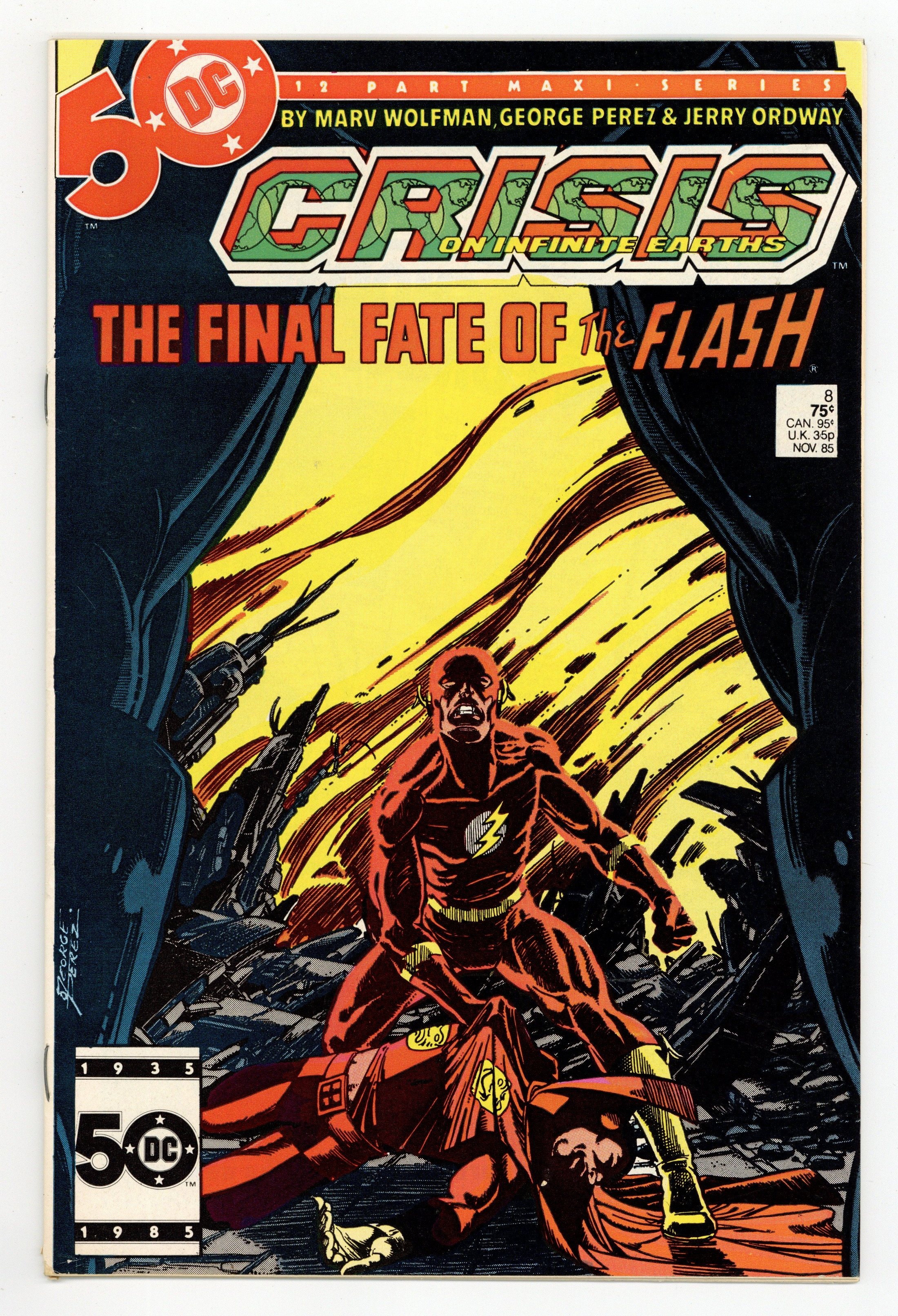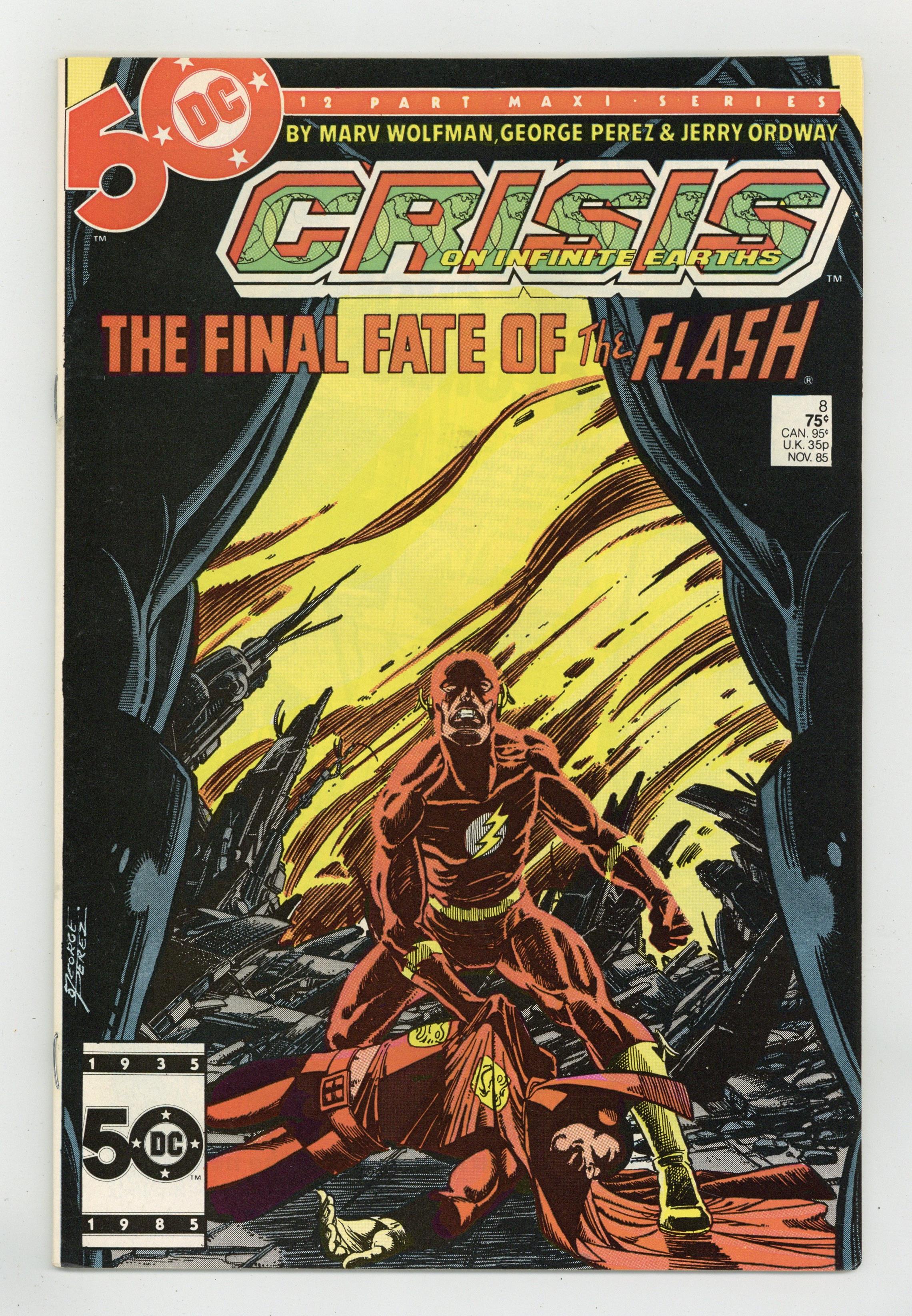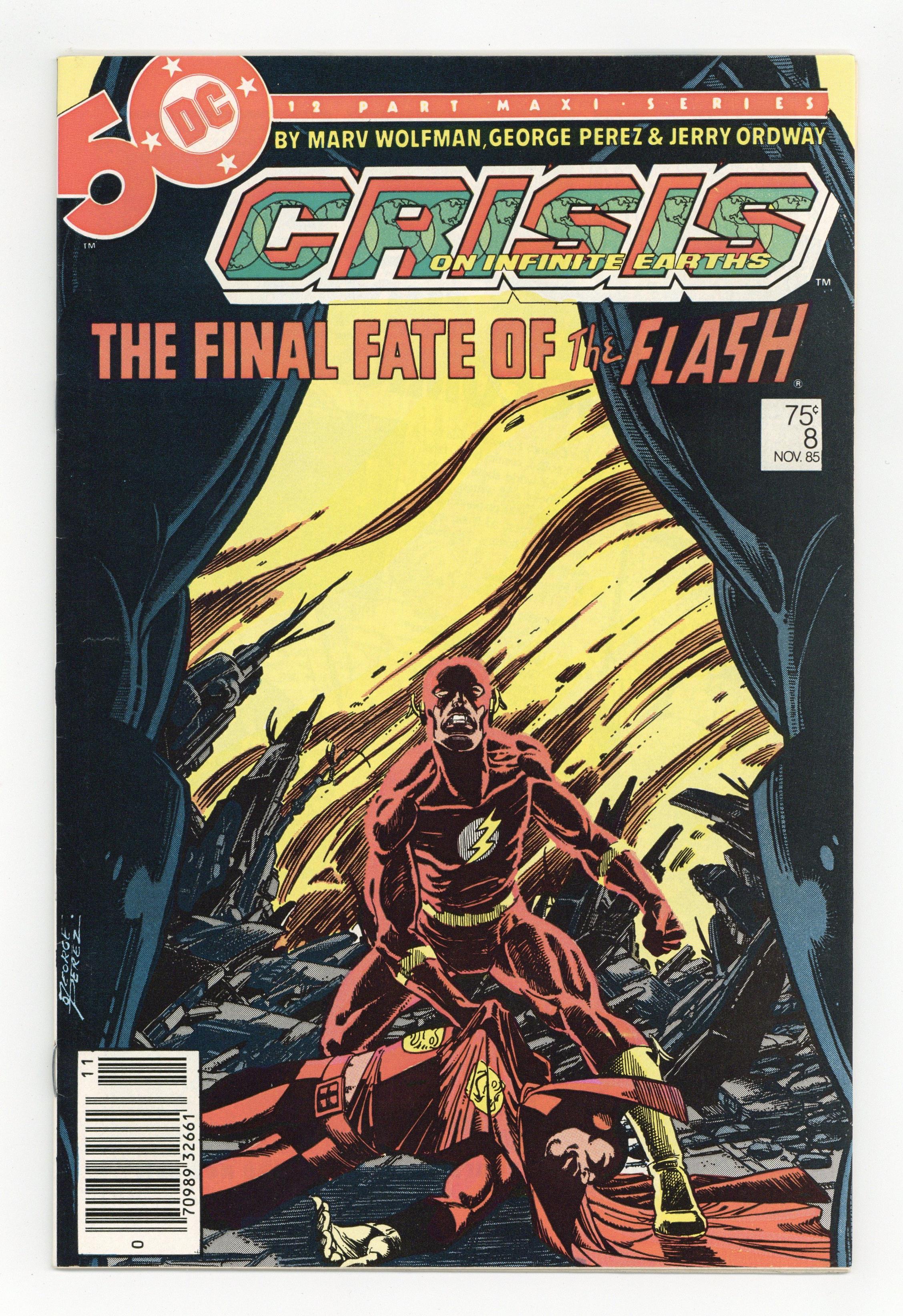 $8.60Direct Edition. "A Flash of the Lightning!" Written by Marv Wolfman. Art by George Perez and Jerry Ordway. Fresh off his set-back of last issue, the nefarious Anti-Monitor is reborn and he's more powerful and more determined than ever to destroy all life in the multiverse. As this sinister villain threatens to destroy all life in the positive universe, the only one left to stop him is the Flash, but at what cost. Don't miss one of the most heroic moments in the history of this medium as the Scarlet Speedster sacrifices all to preserve life in the DCU. Featuring the heroic death of the Flash (Barry Allen). NOTE: This was a character defining moment that can still be felt in the Post-Crisis DCU today. - Odinson, Lone Star Comics Archivist Cover price $0.75.