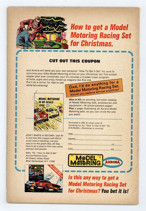Starts Apr 4 Written by Gardner Fox. Art by Carmine Infantino and Sid Greene. Cover by Carmine Infantino and Murphy Anderson. 1st appearance of the new Batgirl (Barbara Gordon) in The Million Dollar Debut of Batgirl!; Batgirl goes to a costume party dressed as Batgirl; she sees Killer Moth attack Bruce Wayne. Written by Gardner Fox. Art by Murphy Anderson. Riddle of the Sleepytime Taxi!; Ralph Elongated Man Dibny and Sue fall asleep in the back seat of a taxi while going to a costume party; Ralph discovers that crooks criminals are putting passengers to sleep to copy secret documents. Cap's Hobby Hints activity page by Henry Boltinoff. Letter to the editor from comics writer Mark Evanier. 36 pages, full color. $0.12. Cover price $0.12.