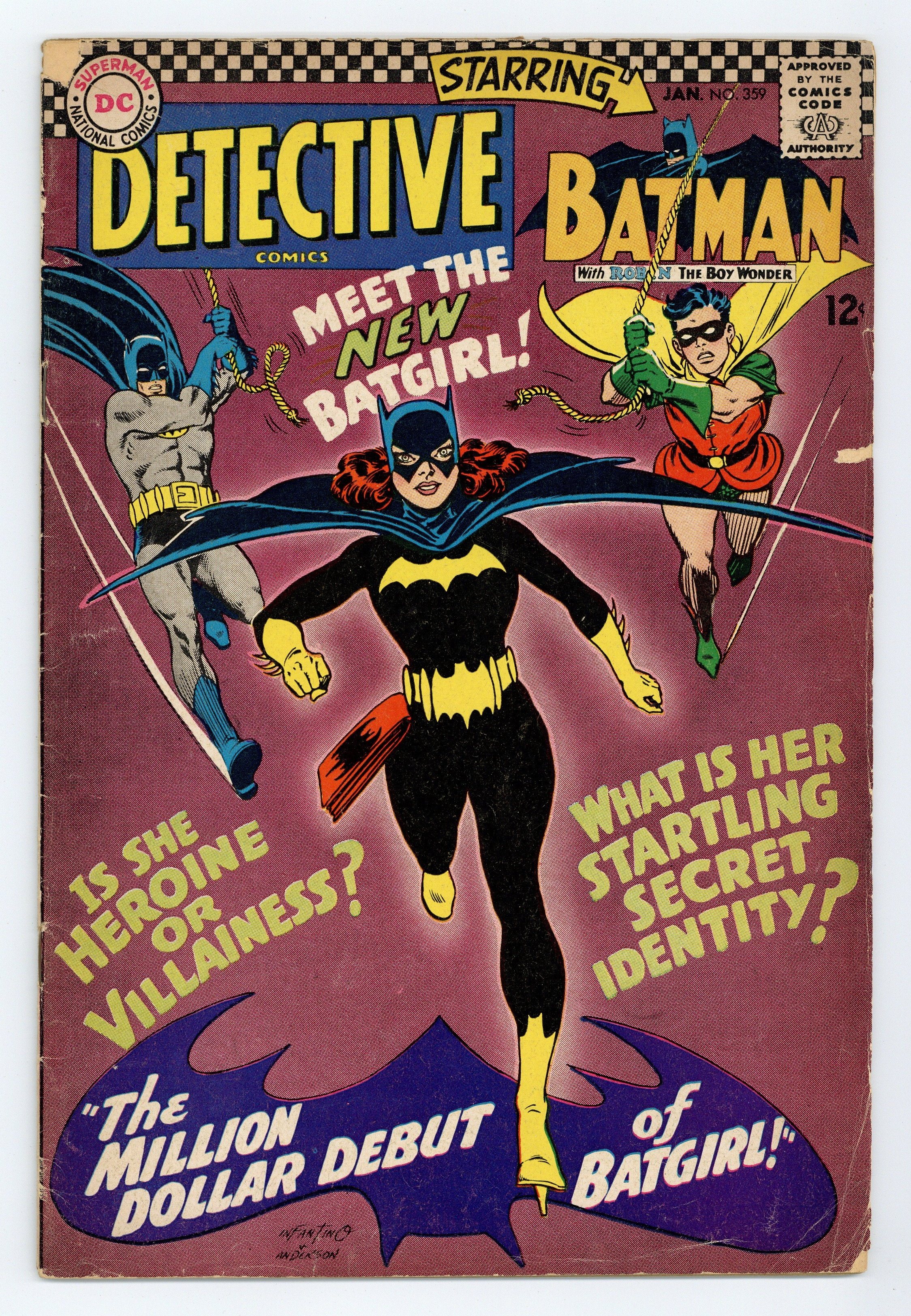 Written by Gardner Fox. Art by Carmine Infantino and Sid Greene. Cover by Carmine Infantino and Murphy Anderson. 1st appearance of the new Batgirl (Barbara Gordon) in The Million Dollar Debut of Batgirl!; Batgirl goes to a costume party dressed as Batgirl; she sees Killer Moth attack Bruce Wayne. Written by Gardner Fox. Art by Murphy Anderson. Riddle of the Sleepytime Taxi!; Ralph Elongated Man Dibny and Sue fall asleep in the back seat of a taxi while going to a costume party; Ralph discovers that crooks criminals are putting passengers to sleep to copy secret documents. Cap's Hobby Hints activity page by Henry Boltinoff. Letter to the editor from comics writer Mark Evanier. 36 pages, full color. $0.12. Cover price $0.12.