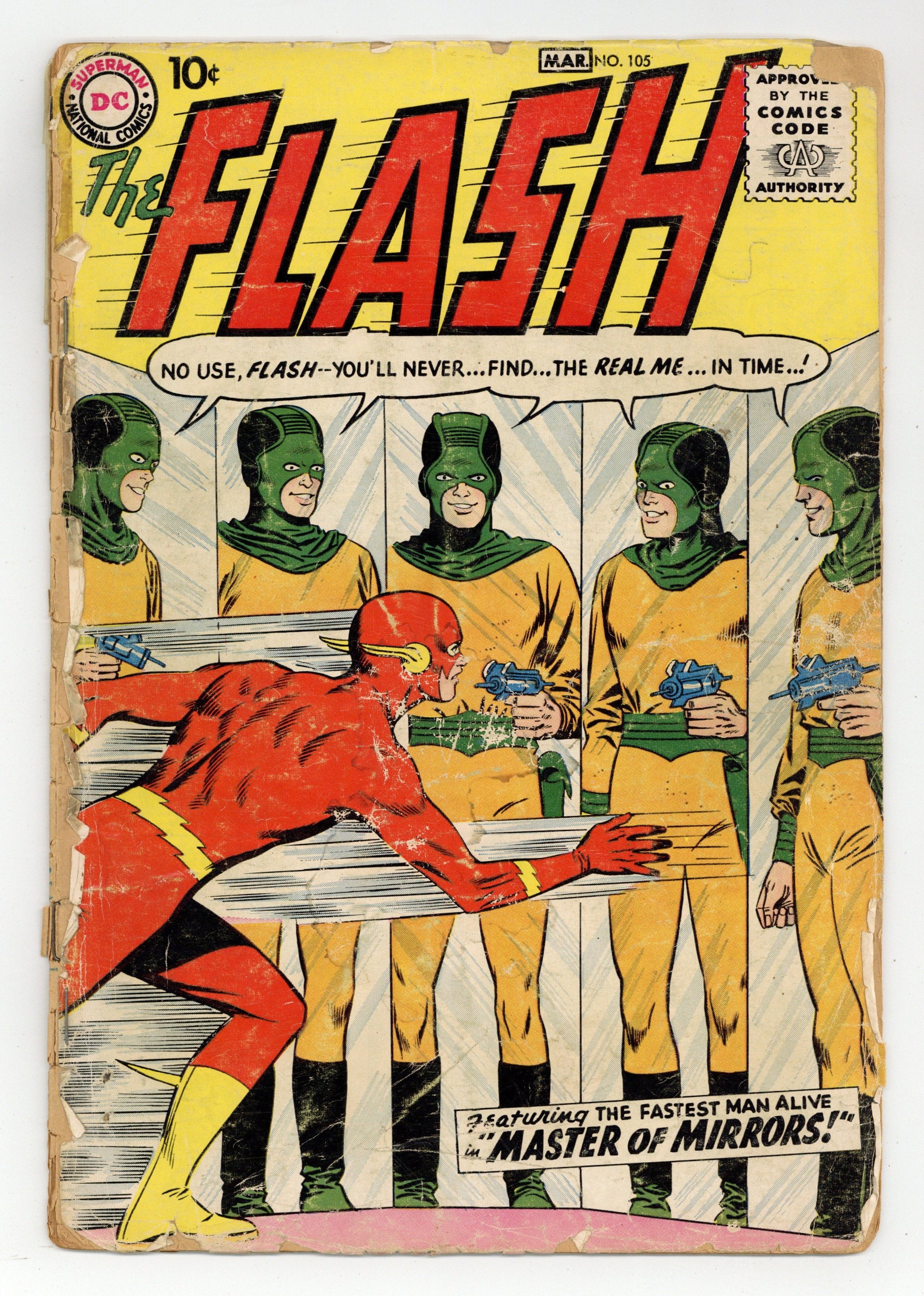 First issue in the Silver Age Flash series. Cover pencils by Carmine Infantino, inks by Joe Giella. 1st appearance of the Mirror Master in Master of Mirrors, script by John Broome, pencils by Carmine Infantino, inks by Joe Giella; Flash battles Sam The Mirror Master Scudder. Conqueror from 8 Million B.C.!, script by John Broome, pencils by Carmine Infantino, inks by Joe Giella; John Haines frees Katmos from his suspended animation and he begins his plans to take over the world. Amazing Speeds fact page by Julius Schwartz. Flash Facts filler page by Julius Schwartz. Birds In Flight fact page. Nature Wonderland fact page. 36 Pages, Full Color. Cover price $0.10.