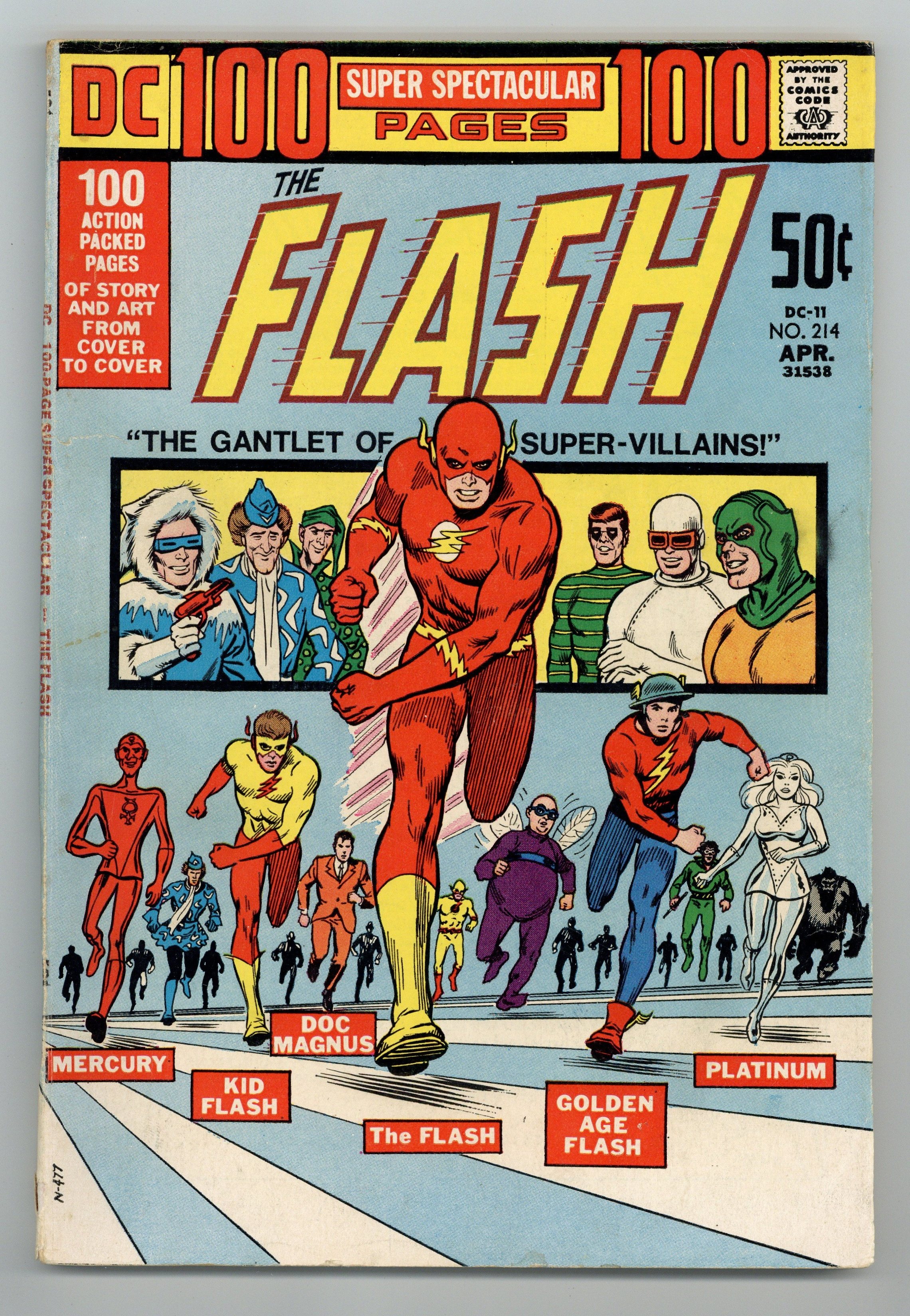 DC 100 Page Super Spectacular DC-11. Cover art by Nick Cardy. Never-before-published Golden Age Flash story, The Tale of the Three Tokens, script by Robert Kanigher, pencils by Carmine Infantino, inks by Bernard Sachs; The Thinker steals a time machine and plans to use it to rob banks but is stopped by the Flash and the inventor of the time machine. Gauntlet of Super-Villains (from Flash 155), script by John Broome, pencils by Carmine Infantino, inks by Joe Giella; Gorilla Grodd uses his powers to switch bodies with a gorilla in the Central City zoo and from there he uses Flash's greatest foes to battle Flash until he can take control of Barry Allen's mind. Flash Facts! meteors, tornados, the flying speed of ducks, and tidal waves. The Wasp starring Quicksilver (from National Comics 67), art by Dan Zolnerowich. The Face Behind the Mask starring Kid Flash (from Flash 122), script by John Broome, pencils by Carmine Infantino, inks by Joe Giella. The Modern Paul Bunyan! starring Johnny Quick (from Adventure 179), pencils by Paul Norris, inks by Sy Barry. The Flaming Doom! starring the Metal Men (from Showcase 37), script by Robert Kanigher, pencils by Ross Andru, inks by Mike Esposito. The Weather Wizard Blows Up A Storm!, script by Gardner Fox, pencils by Carmine Infantino, inks by Joe Giella. Two famous Flash covers, Showcase #4 and The Flash #155, reprinted on the inside back cover. 100 Pages, Full Color. Cover price $0.50.
