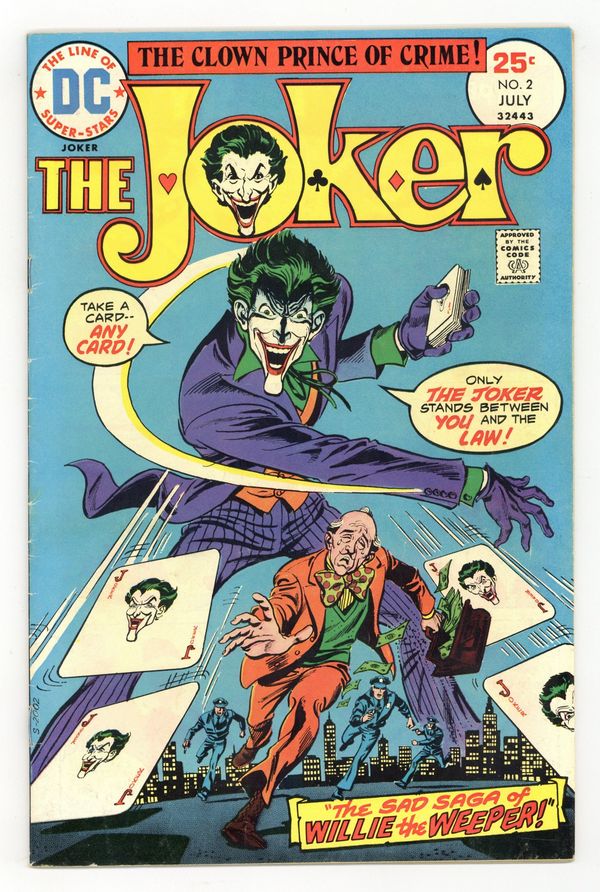 Cover pencils by Ernie Chan, inks by Jose Luis Garcia-Lopez. "The Sad Saga of Willy the Weeper!," script by Denny O'Neil, pencils by Irv Novick, inks by Jose Luis Garcia-Lopez; The Joker teams up with Willie the Weeper when Willie breaks him out of Arkham; The Joker then helps him steal platinum but is thwarted by Gordon. Superman ad. 1 page Joker text article "The Wildest Card, Part 2," about the history of the Joker. 36 pgs., full color. $0.25. Cover price $0.25.