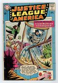 Cover pencils by Mike Sekowsky, inks by Murphy Anderson. Four Worlds to Conquer!, script by Gardner Fox, pencils by Mike Sekowsky, inks by Bernard Sachs; Despero escapes his prison and ages half the JLA and dispatches the other half to alternate worlds; When Despero tries to pass himself off as an aged Superman, Wonder Woman snares him in her magic lasso and makes him return the missing members and de-age the others. Give and Take public service announcement, script by Jack Schiff, art by Sheldon Moldoff. 36 pgs. $0.12. Cover price $0.12.