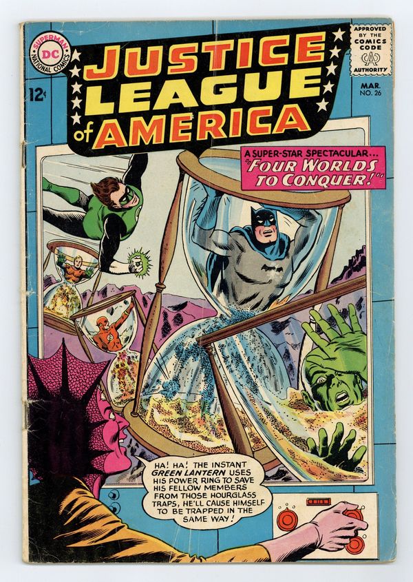 $12.00Cover pencils by Mike Sekowsky, inks by Murphy Anderson. Four Worlds to Conquer!, script by Gardner Fox, pencils by Mike Sekowsky, inks by Bernard Sachs; Despero escapes his prison and ages half the JLA and dispatches the other half to alternate worlds; When Despero tries to pass himself off as an aged Superman, Wonder Woman snares him in her magic lasso and makes him return the missing members and de-age the others. Give and Take public service announcement, script by Jack Schiff, art by Sheldon Moldoff. 36 pgs. $0.12. Cover price $0.12.