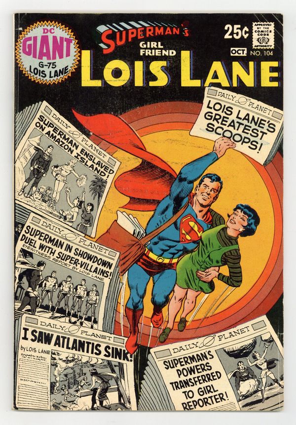 Cover pencils by Curt Swan, inks by Murphy Anderson. The Super-Prisoner of Amazon Island, script by Otto Binder, pencils by Wayne Boring, inks by Stan Kaye; Lois belongs to a club of women whose lives have been saved by Superman, and while on a cruise, the club is marooned on an island ruled by Amazon warriors. The Monkey's Paw!, script by Jerry Siegel, art by Kurt Schaffenberger; Lois acquires the magical monkey's paw, but throws it away before using its three wishes. The Town of Supermen!, script by Jerry Siegel, art by John Forte; Lois Lane is invited to a ghost town by eight escaped Phantom Zone criminals in a plot to capture Superman. Lois Lane's Great Houdini Trick!, script by Otto Binder, art by Kurt Schaffenberger; Lois sets out to expose a Swami and ends up finding a mobster in hiding. The Reversed Super-Powers!, script by Jerry Siegel, art by Kurt Schaffenberger; While trying to make himself immune to Kryptonite an explosion in the lab removes Superman's power and gives Lois powers. The Girl Who Destroyed Atlantis!, script by Leo Dorfman, art by Kurt Schaffenberger; Lois travels back in time to Atlantis when it was above the sea and discovers its leader Roh-Tul is not the humanitarian he pretends to be. 68 Pages, Full Color. Cover price $0.25.