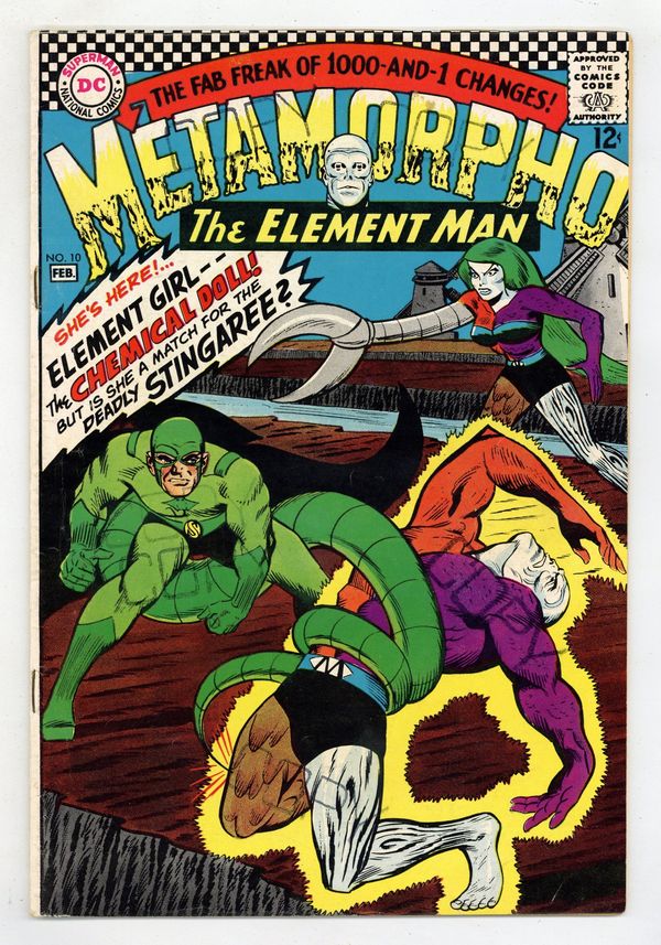 $25.50Origin & 1st appearance of Element Girl. Cover pencils by Sal Trapani, inks by Charles Paris. The Sinister Snares of Stingaree!, script by Bob Haney, pencils by Sal Trapani, inks by Charles Paris; Element Girl stops the wedding of Rex and Sapphire to ask Metamorpho's help in stopping Stingaree; Metamorpho and Element Girl discover Stingaree's plan. 36 pgs. $0.12. Cover price $0.12.