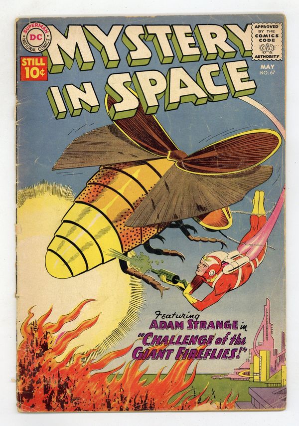 Adam Strange stars in "Challenge of the Giant Fireflies!" (pencils by Carmine Infantino). Back-up stories: "Language-Master of Space!" (art by Sid Greene?) and "Mystery Message from Fort Nova!" (pencils by Gil Kane). Infantino cover pencils. 36 Pages, Full Color. Cover price $0.10.