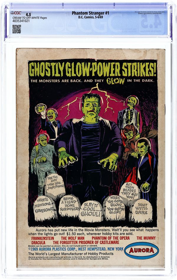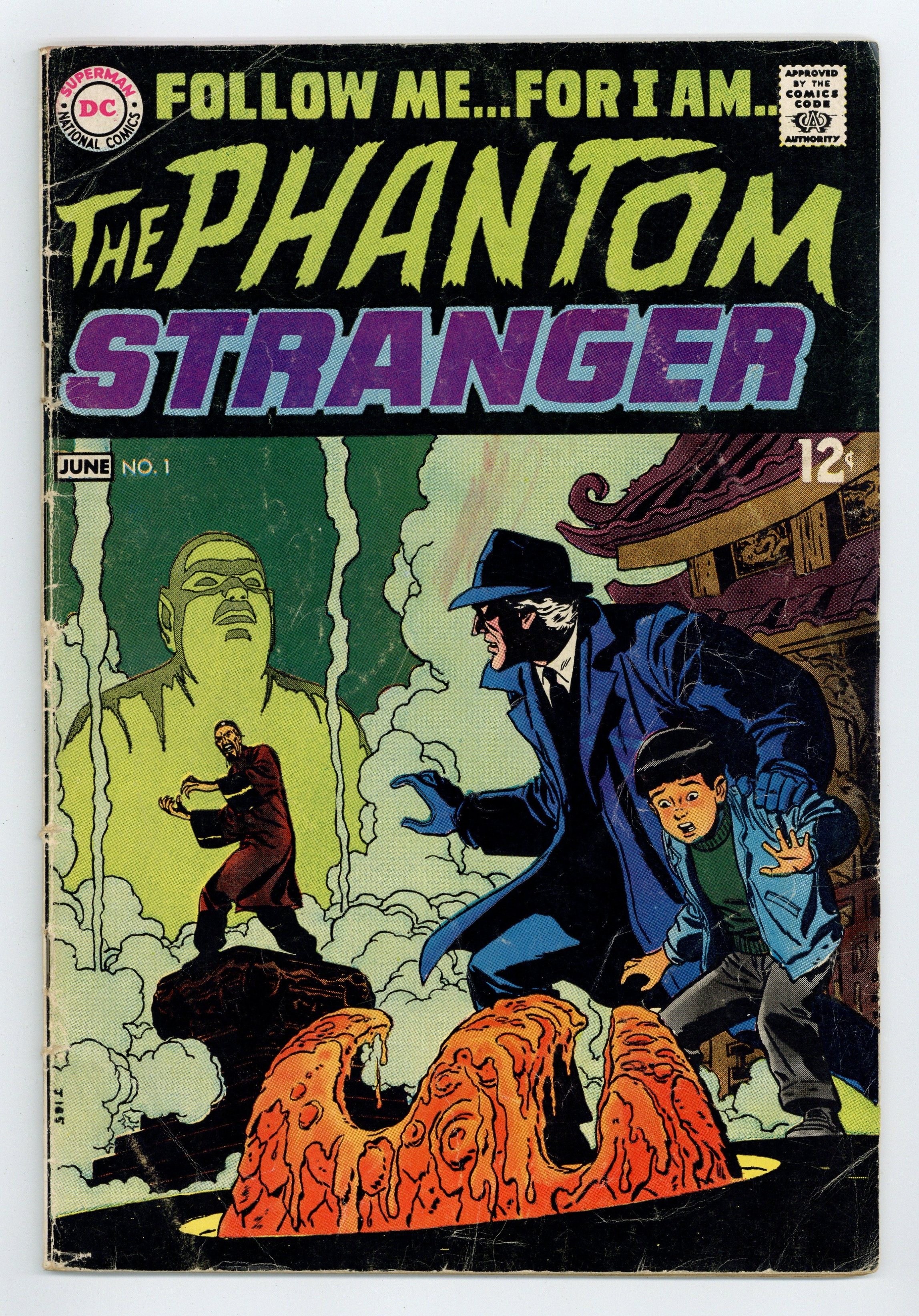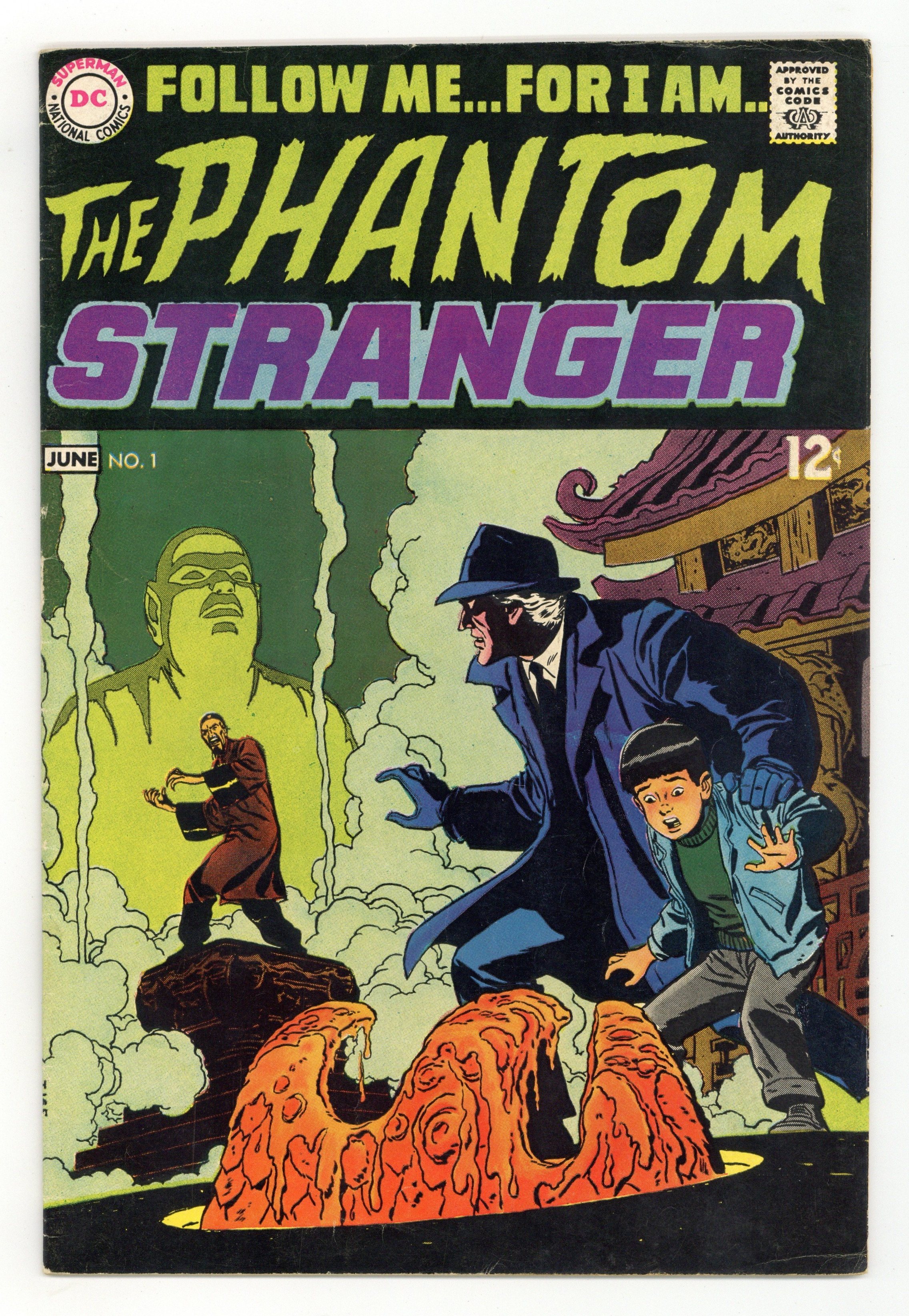 $44.00First and only 12-cent cover price. Cover art by Bill Draut. "When Ghosts Walk!", script by Mike Friedrich (p. 1 and top half of p2-3) and John Broome (bottom half of p2-3, 4-7), pencils by Bill Draut (p. 1 and top half of p2-3) and Carmine Infantino (bottom half of p2-3, 4-7), inks by Bill Draut (p. 1 and top half of p2-3) and Sy Barry (bottom half of p2-3, 4-7); When three friends die in a plane crash, the spirits seem to be haunting those they left behind, but the Phantom Stranger reveals that the ghostly appearances are really the work of an embezzler attempting to cover his tracks. "The Hermit's Ghost Dog" starring Doctor Terry Thirteen, Marie, Bart Harley, and Dirk the dog, script by Ed Herron, art by Leonard Starr. "Defeat the Dragon Curse...or Die!", script by Mike Friedrich, art by Bill Draut; When Dr. 13 and Marie Leeds visit their friends Harry and Rosemary in San Francisco during the Chinese New Year, they find that their friends have been killed; When the Phantom Stranger appears, he suggests that it is the curse of Ching Hi Fu; The Phantom Stranger works to capture the culprit, a man worshiping Ching Hi Fu, who has been trying to destroy modern buildings which he believes are an effrontery to his Chinese heritage. Letter to the editor from comics writer Martin Pasko. 36 pgs., full color. Cover price $0.12.