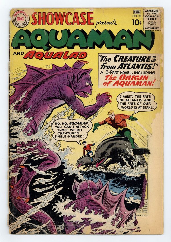 Cover pencils by Dick Dillin, inks by Sheldon Moldoff. The Creatures from Atlantis starring Aquaman and Aqualad, script by Jack Miller, art by Ramona Fradon; Aquaman gets an S.O.S. from Atlantis; Aquaman is captured, but he learns the plans of the Amphibious Aliens. The Battle of the Sea Creatures starring Aquaman and Aqualad, script by Jack Miller, art by Ramona Fradon; Aquaman and Aqualad stop amphibious aliens and force them back to their own dimension. 36 Pages, Full Color. Cover price $0.10.