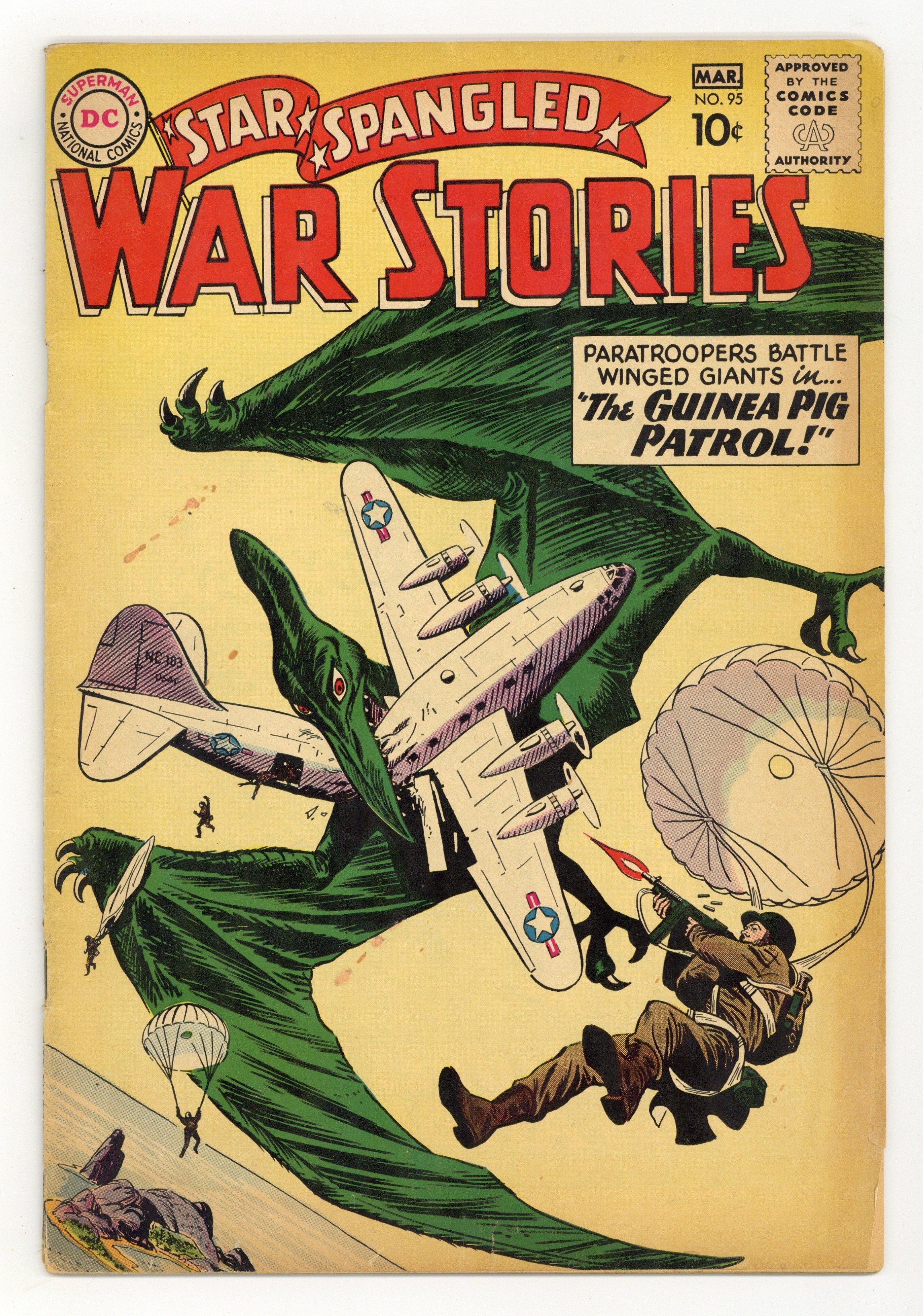 Cover pencils by Ross Andru, inks by Mike Esposito. Guinea Pig Patrol! featuring War That Time Forgot, script by Robert Kanigher, pencils by Ross Andru, inks by Mike Esposito. The Human Torpedo, script by Bob Haney, art by Jack Abel. Gunner from the Past, script by Bob Haney, art by Russ Heath. Screaming Eagle Battle Story of the 101st Airborne Division, script and pencils by Morris Waldinger, inks by Tom Nicolisi. 36 Pages, Full Color. Cover price $0.10.