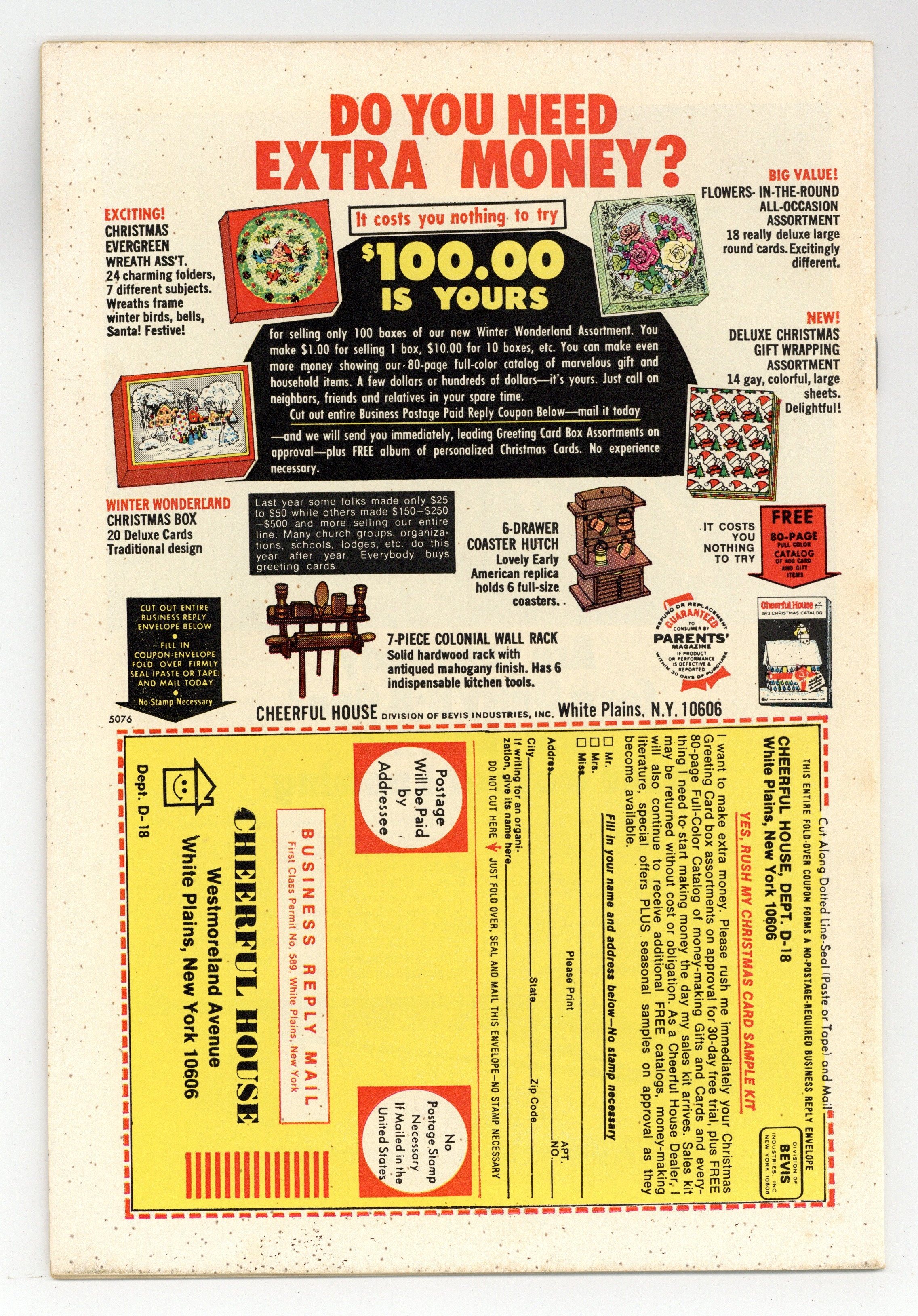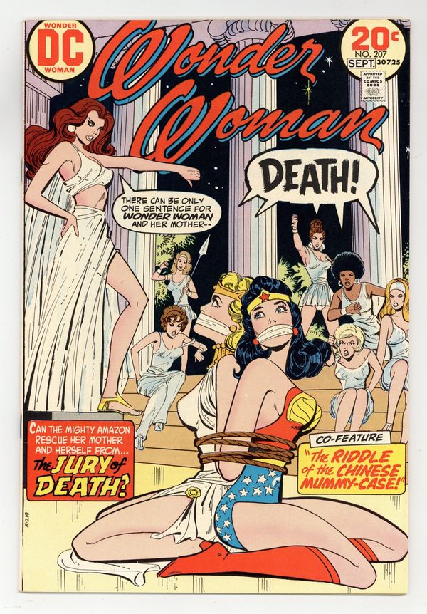 Cover pencils by Ric Estrada, inks by Vince Colletta. "The Riddle of the Chinese Mummy Case!", script by Robert Kanigher, pencils by Ric Estrada, inks by Vince Colletta; Wonder Woman goes back in time to ancient China to aid a princess and to discover why a statue of Wonder Woman was found in a 2000-year-old mummy case. "The Four Dooms!", script by Robert Kanigher, pencils by Ric Estrada, inks by Vince Colletta; Inventa, a criminal scientist sentenced to Transformation Island, escapes her Venus Girdle with a special key of her devising, liberates the rest of the prisoners, and takes Paradise Island by force; Then she sentences Wonder Woman and Queen Hippolyta to the Island of Four Dooms; This a re-imaginating of an Earth-Two Wonder Woman story originally presented in Wonder Woman #33. 36 pages, Full Color. Cover price $0.20.