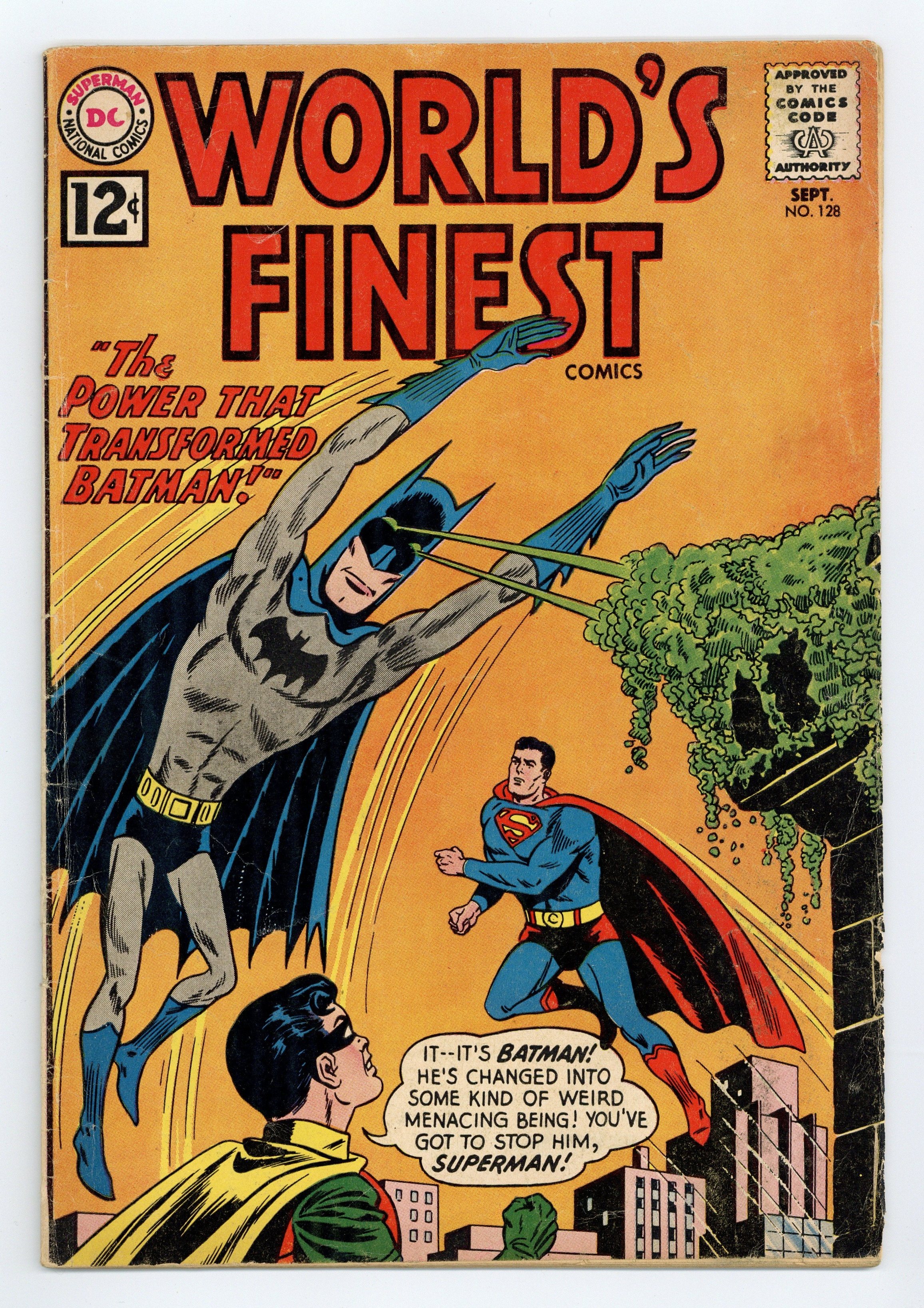 Cover pencils by Dick Dillin, inks by Sheldon Moldoff. The Power That Transformed Batman starring Superman and Batman, script by Jerry Coleman, art by Jim Mooney; Under the influence of a weird space meteor Batman becomes susceptible to kryptonite. Rules of Water Safety! starring Buzzy, script by Jack Schiff, art by Win Mortimer. The Trial Of Aquaman starring Aquaman and Aqualad, script by Jack Miller, art by Ramona Fradon; Aquaman is on trial for piracy and the death of Aqualad. The Too-Old Hero starring Green Arrow, script by Dave Wood, art by Lee Elias; Patrolman Charlie Donley is getting to old for his job and is moved to a desk job, until he saves Green Arrow and Speedy from some bank robbers. 36 Pages, Full Color. Cover price $0.12.