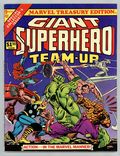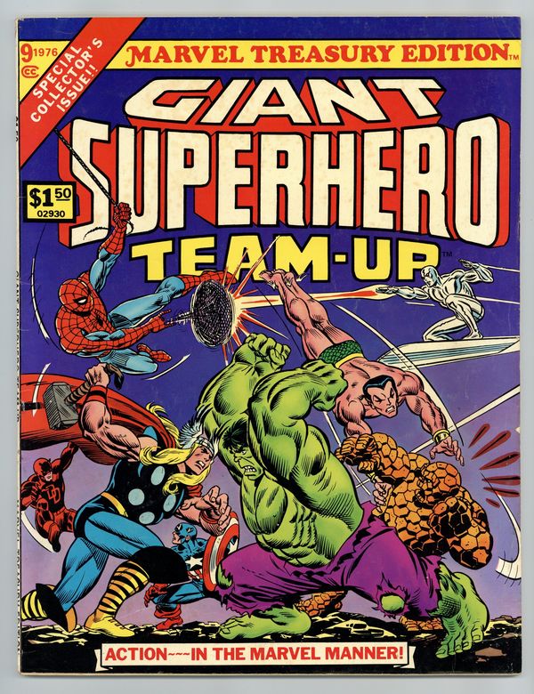 Marvel Treasury Edition (1974) #9 features the Giant Superhero Team-Up. This issue features some of the mightiest Marvel team-ups and super-hero battles including "In the Rage of Battle" Thing vs. Sub-Mariner (Reprints Sub-Mariner #8) by Roy Thomas, John Buscema, and Dan Adkins, "In Combat with Captain America" Daredevil vs. Captain America (Reprints Daredevil #43) by Stan Lee and Gene Colan, "The Mighty Thor Battles the Incredible Hulk" 'nuff said (Reprints Thor #112) by Stan Lee and Jack Kirby, and "The Surfer and the Spider" Spider-Man vs. Silver Surfer (Reprints Silver Surfer #14) by Stan Lee and John Buscema. Guest-starring the Avengers. 84 pages, FC. Cover price $1.50.