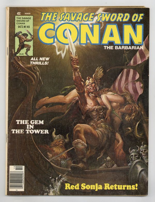 Conan stars in "The Gem in the Tower." Script by Roy Thomas, pencils by John Buscema, inks by Tony DeZuniga. Adapted from the short story by L. Sprague de Camp and Lin Carter. Red Sonja stars in "Master of Shadows." Script by Christy Marx, pencils by Buscema, inks by DeZuniga. "Chains and Fetters: A Study of Slavery in the Hyborian Age," article by Jim Neal, full-page illustration by Buscema/Kerry Gammill; another illo by Neal Adams? "A Conan Quiz" by Jim Neal, illustration by Sandy Plunkett. Ernie Chan frontispiece. Nestor Redondo cover. Cover price $1.25.