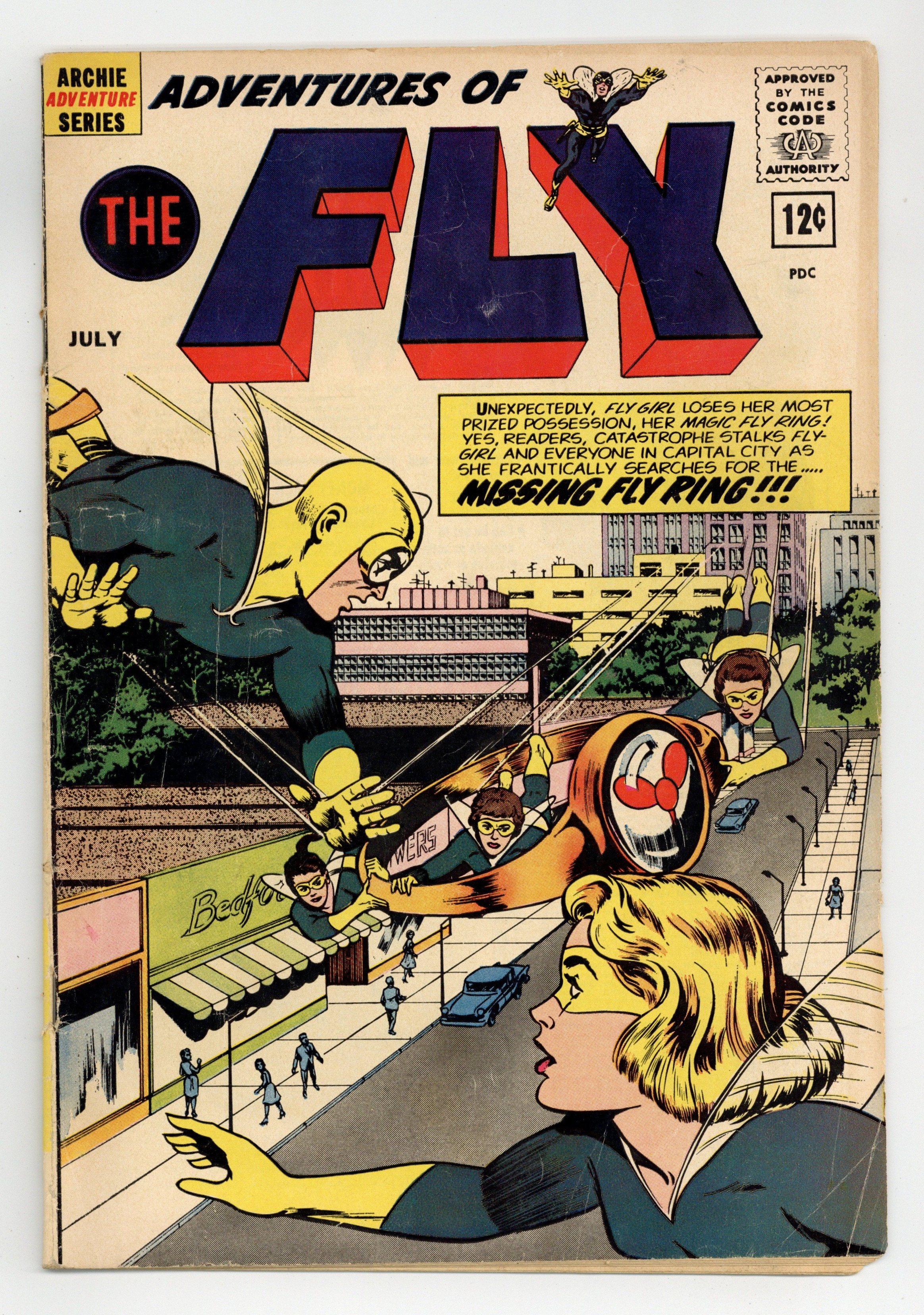 Published Jul 1962 by Archie Publications.$17.00Edited by Victor Gorelick. Cover by John Rosenberger. Stories by Robert Bernstein and John Rosenberger. Archie Comics amiable and agile super-hero The Fly battles an assortment of nefarious villains. Plus, Fly Girl loses her Fly Ring. 36 pages, full color. $0.12. Cover price $0.12.