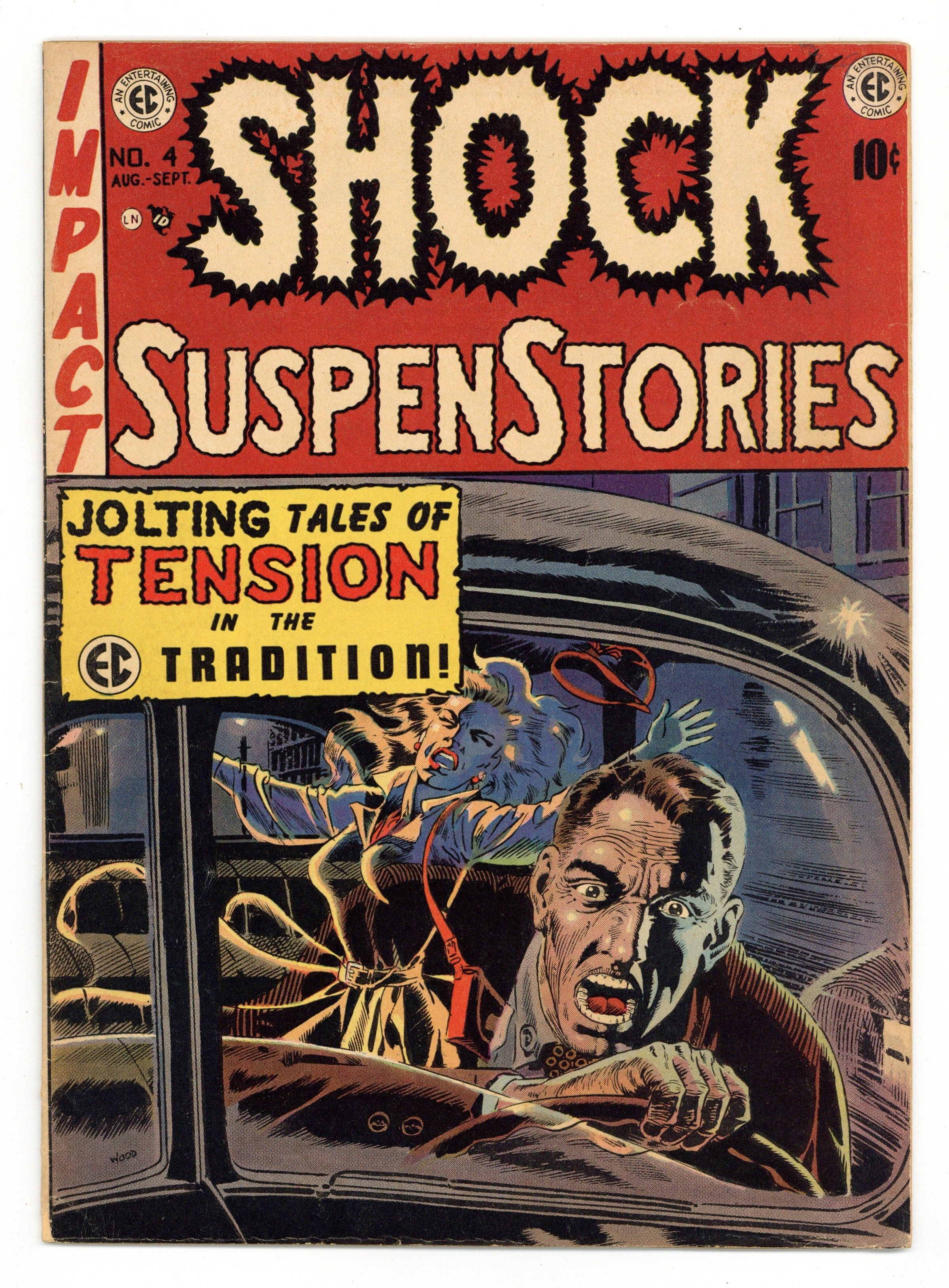 Cover art by Wally Wood. Split Second!, script by Bill Gaines (co-plot) and Albert B. Feldstein (co-plot, script), art by Jack Kamen; When a lumberjack boss blinds a young worker by hitting him in the head with a rock, the other lumberjacks gag him and stuff him in a hollow log for the blind boy to practice chopping through......and Liz, his wife, is next! Confession, script by Bill Gaines (co-plot) and Albert B. Feldstein (co-plot, script), art by Wally Wood; Police Lieutenant Staley murders his wife and then beats a confession out of an innocent by-stander. Last Ride! text story by Albert B. Feldstein. Salvation! text story by Albert B. Feldstein. Strictly Business!, script by Bill Gaines (co-plot) and Albert B. Feldstein (co-plot, script), art by Joe Orlando; In the 21st Century, marriage licenses must be renewed every three years, so a man pays a woman thirty thousand dollars to be his wife for three years, but both agree on no sex. Uppercut!, script by Bill Gaines (co-plot) and Albert B. Feldstein (co-plot, script), art by Jack Davis. A fight promoter tells the boys he sends into the ring that they've got to have guts; One of the washed-up cases steals a drug from his brother in med school that will make a person look dead, but still be alive, so that the promoter will be buried alive. 36 pgs. $0.10. Cover price $0.10.