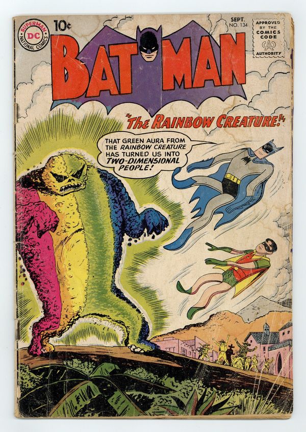 Starts Apr 4 Cover by Sheldon Moldoff. "The Rainbow Creature," script by Bill Finger, art by Sheldon Moldoff; The Caped Crusaders, in South America to provide assistance to a leader, encounter a strange rainbow-colored creature that has emerged from a volcano. One-page Jail Jests story by Henry Boltinoff. Bike Safety = Bike Fun! public service announcement, art by Bernard Baily. "Batman's Secret Enemy," script by Bill Finger, art by Sheldon Moldoff; Bruce receives a very disturbing letter from someone, indicating that they know Batman's secret identity; The Caped Crusaders cature three crooks, believing any one of them may have written the letter. Half-page Casey the Cop story by Henry Boltinoff. "The Deadly Dummy," script by Bill Finger, pencils by Sheldon Moldoff, inks by Charles Paris; Hurt deeply by people making fun of him because of his size, Danny decides to turn to crime and runs into the Caped Crusaders. 36 Pages, Full Color. Cover price $0.10.