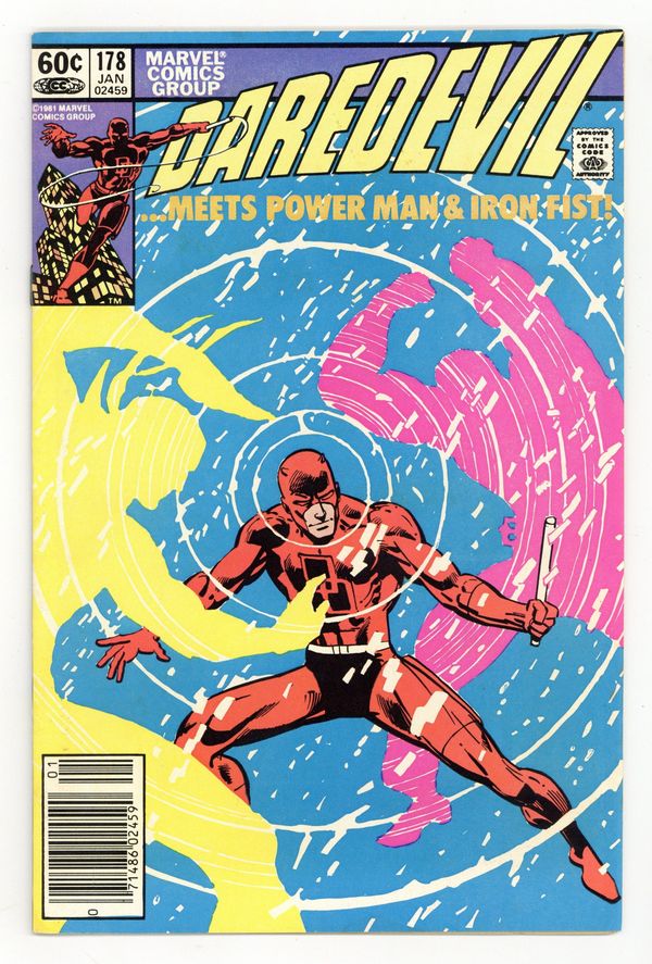 $25.00Newsstand Edition. "Paper Chase" Written by Frank Miller. Pencils by Frank Miller (breakdowns) and Klaus Janson (finished art), inks by Klaus Janson. Cover pencils by Frank Miller with inks by Klaus Janson. Foggy hires Power Man and Iron Fist to help protect the stooge who is going to help Nelson and Murdock link Mayoral candidate Cherryh to the Kingpin. Kingpin talks to Elektra about employment opportunities. Appearance by J. Jonah Jameson. Notes: Story continued in Power Man and Iron Fist #77. Promo Pin-Up for Power Man and Iron Fist #77 with art by Denys Cowan. First 60-cent issue. Cover price $0.60.