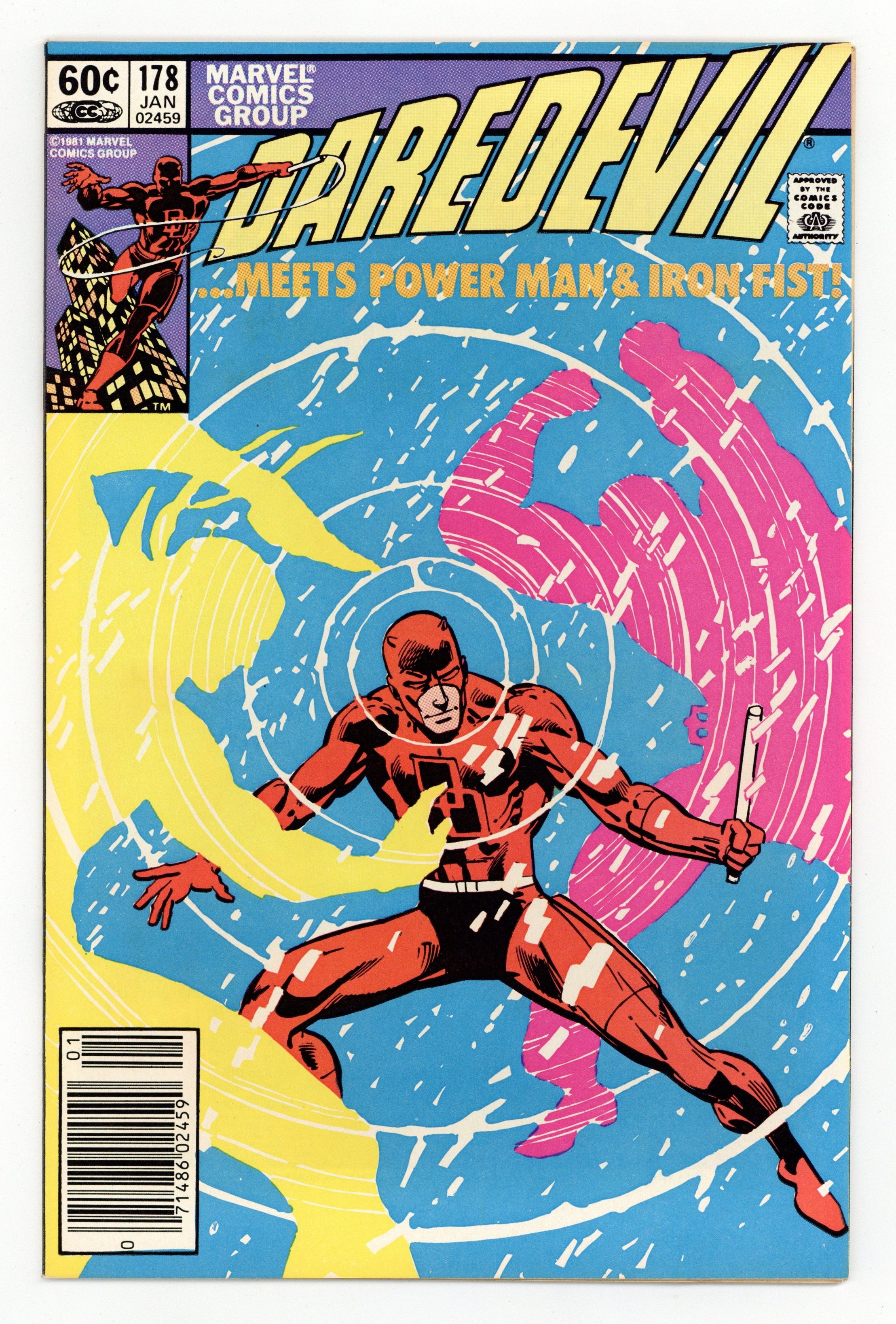 $8.80Newsstand Edition. "Paper Chase" Written by Frank Miller. Pencils by Frank Miller (breakdowns) and Klaus Janson (finished art), inks by Klaus Janson. Cover pencils by Frank Miller with inks by Klaus Janson. Foggy hires Power Man and Iron Fist to help protect the stooge who is going to help Nelson and Murdock link Mayoral candidate Cherryh to the Kingpin. Kingpin talks to Elektra about employment opportunities. Appearance by J. Jonah Jameson. Notes: Story continued in Power Man and Iron Fist #77. Promo Pin-Up for Power Man and Iron Fist #77 with art by Denys Cowan. First 60-cent issue. Cover price $0.60.