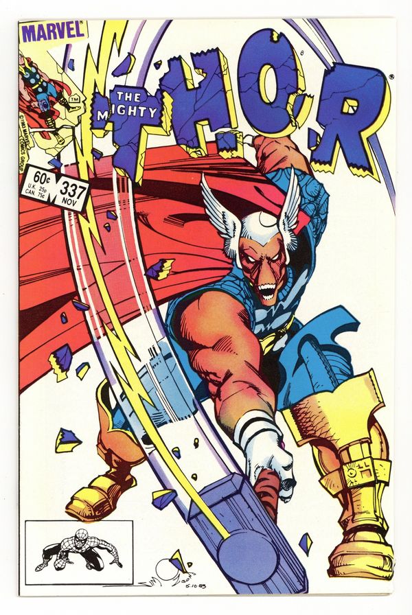 Starts Dec 15 Newsstand Edition. Cover by Walt Simonson. Beta Ray Bill (first appearance) becomes Thor in "Doom!", script and art by Walt Simonson; Nick Fury asks Thor's aid in investigating an alien ship heading for earth; Thor arrives and triggers the awakening of an alien protector, Beta Ray Bill; Bill bests Thor and takes up his hammer only to be accidentally summoned to Asgard by Odin who thinks he is summoning Thor. Brief appearances by Nick Fury, Loki, Sif, Balder, Heimdall, Volstagg, and Odin. First appearance of Lorelei (sister of the Enchantress). Begins Walt Simonson's run on Thor (through #382). Bullpen Bulletins. Star Frontiers TSR ad. 36 pgs., full color. $0.60. Cover price $0.60.