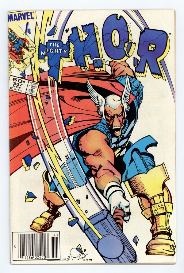 Ends Mar 30 9:47 PM CST Bid History 11 bids Current Bid $47 Your Secret Max Bid If you'd like to bid, please log in or register. Newsstand Edition. Cover by Walt Simonson. Beta Ray Bill (first appearance) becomes Thor in "Doom!", script and art by Walt Simonson; Nick Fury asks Thor's aid in investigating an alien ship heading for earth; Thor arrives and triggers the awakening of an alien protector, Beta Ray Bill; Bill bests Thor and takes up his hammer only to be accidentally summoned to Asgard by Odin who thinks he is summoning Thor. Brief appearances by Nick Fury, Loki, Sif, Balder, Heimdall, Volstagg, and Odin. First appearance of Lorelei (sister of the Enchantress). Begins Walt Simonson's run on Thor (through #382). Bullpen Bulletins. Star Frontiers TSR ad. 36 pgs., full color. $0.60. Cover price $0.60.
