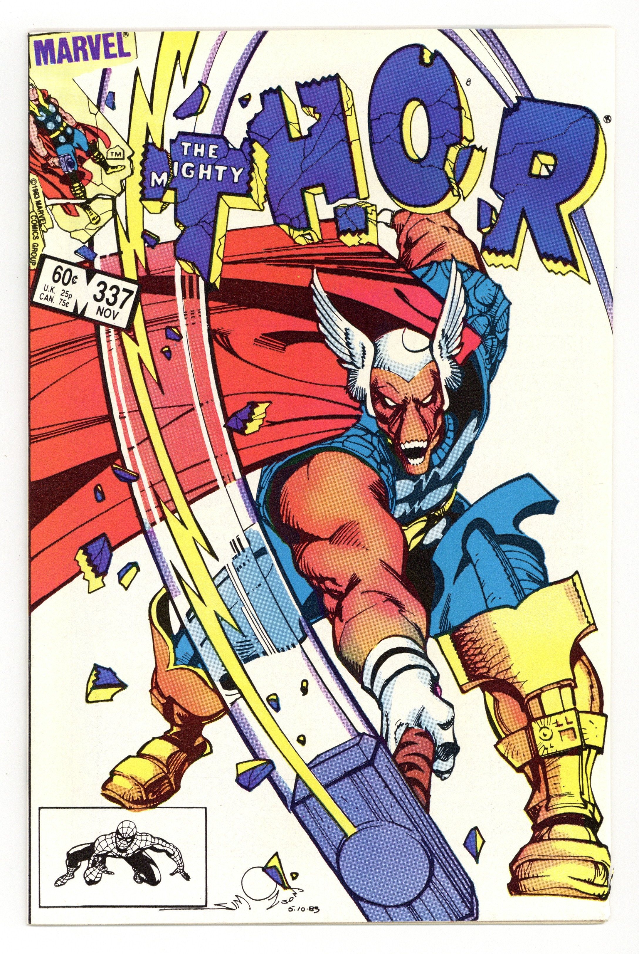 Ends Dec 15 9:49 PM CST Bid History 5 bids Current Bid $56 Your Secret Max Bid If you'd like to bid, please log in or register. Newsstand Edition. Cover by Walt Simonson. Beta Ray Bill (first appearance) becomes Thor in "Doom!", script and art by Walt Simonson; Nick Fury asks Thor's aid in investigating an alien ship heading for earth; Thor arrives and triggers the awakening of an alien protector, Beta Ray Bill; Bill bests Thor and takes up his hammer only to be accidentally summoned to Asgard by Odin who thinks he is summoning Thor. Brief appearances by Nick Fury, Loki, Sif, Balder, Heimdall, Volstagg, and Odin. First appearance of Lorelei (sister of the Enchantress). Begins Walt Simonson's run on Thor (through #382). Bullpen Bulletins. Star Frontiers TSR ad. 36 pgs., full color. $0.60. Cover price $0.60.