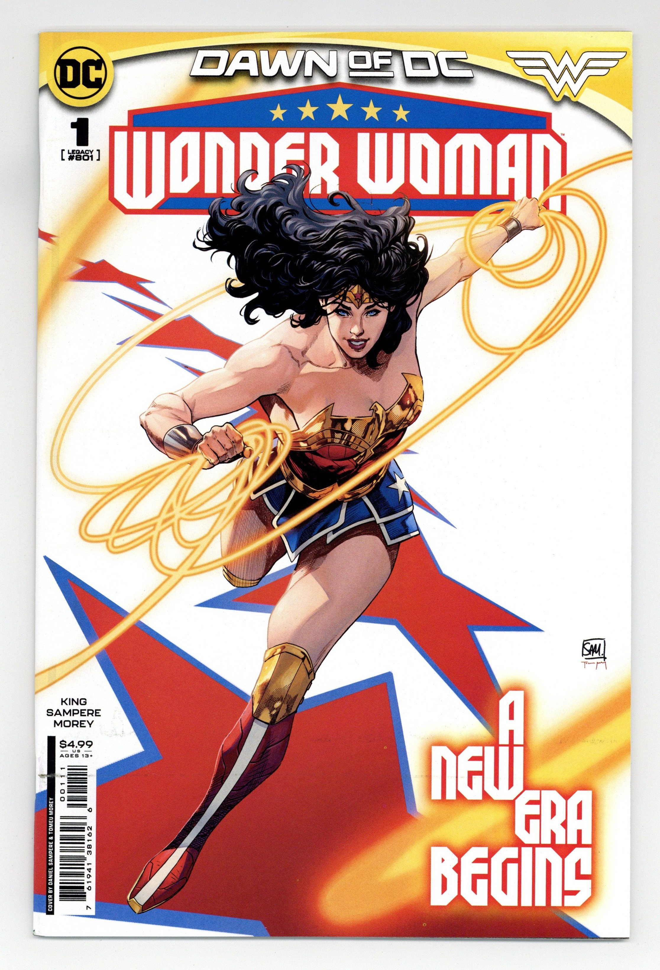 Written by Tom King. Art by Daniel Sampere. Cover by Daniel Sampere. THE AMAZON WARRIOR IS NOW A WANTED OUTLAW! A NEW ERA FOR THE AMAZON WARRIOR BEGINS, FROM THE SUPERSTAR TEAM OF TOM KING AND DANIEL SAMPERE! After a mysterious Amazonian is accused of mass murder, Congress passes the Amazon Safety Act, barring all Amazons from U.S. soil. To carry out their plans, the government starts a task force, the Amazon Extradition Entity (A.X.E.), to remove those who don't comply, by any means necessary. Now, in her search for the truth behind the killing, Wonder Woman finds herself an outlaw in the world she once swore to protect! Writer Tom King (Batman, Mister Miracle, Supergirl: Woman of Tomorrow) and superstar artist in the making Daniel Sampere (Dark Crisis, Action Comics) join forces for this action-packed relaunch and the beginning of what will undoubtedly become a groundbreaking run on the character. 40 pages, full color. Rated T+ Cover price $4.99.