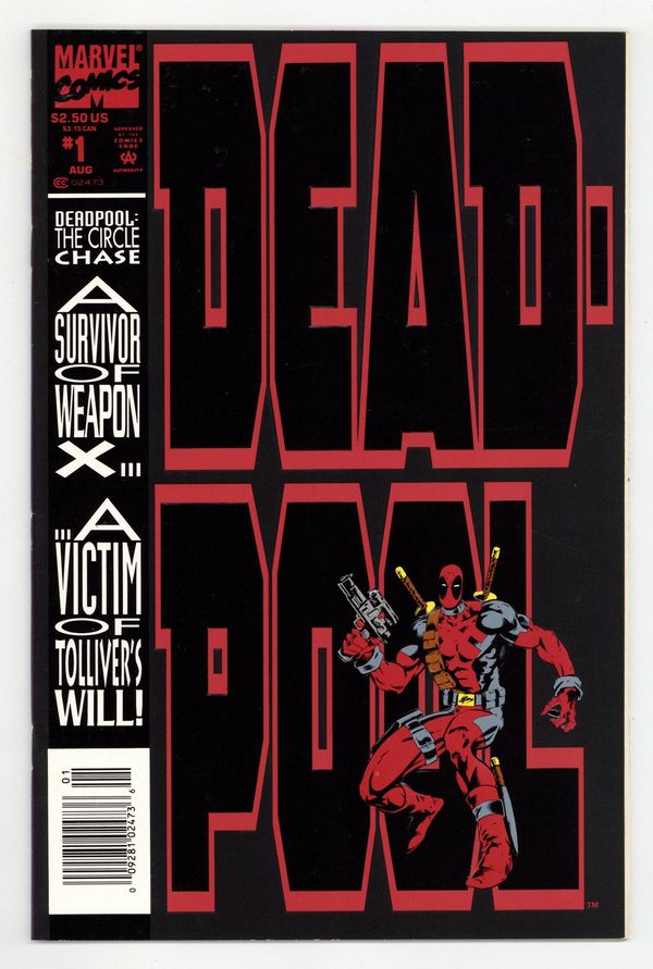 Tags: X-Men$10.00Newsstand Edition. The Circle Chase Round 1: Ducks in a Row - Written by Fabian Nicieza. Art and Cover by Joe Madureira and Mark Farmer. Sporting an outrageous cover -- an embossed figure of Deadpool is positioned leaning against a full cover sized embossed logo. This series pits Deadpool against Juggernaut, Black Tom Cassidy, Nyko and a wicked new villain, Slayback! 32 pages, full color. Cover price $2.50.
