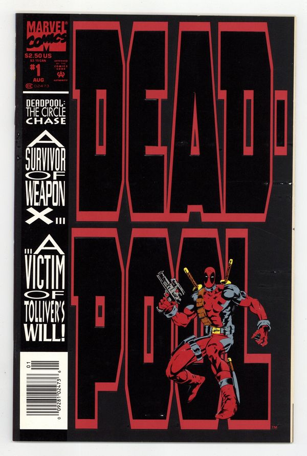 Newsstand Edition. The Circle Chase Round 1: Ducks in a Row - Written by Fabian Nicieza. Art and Cover by Joe Madureira and Mark Farmer. Sporting an outrageous cover -- an embossed figure of Deadpool is positioned leaning against a full cover sized embossed logo. This series pits Deadpool against Juggernaut, Black Tom Cassidy, Nyko and a wicked new villain, Slayback! 32 pages, full color. Cover price $2.50.