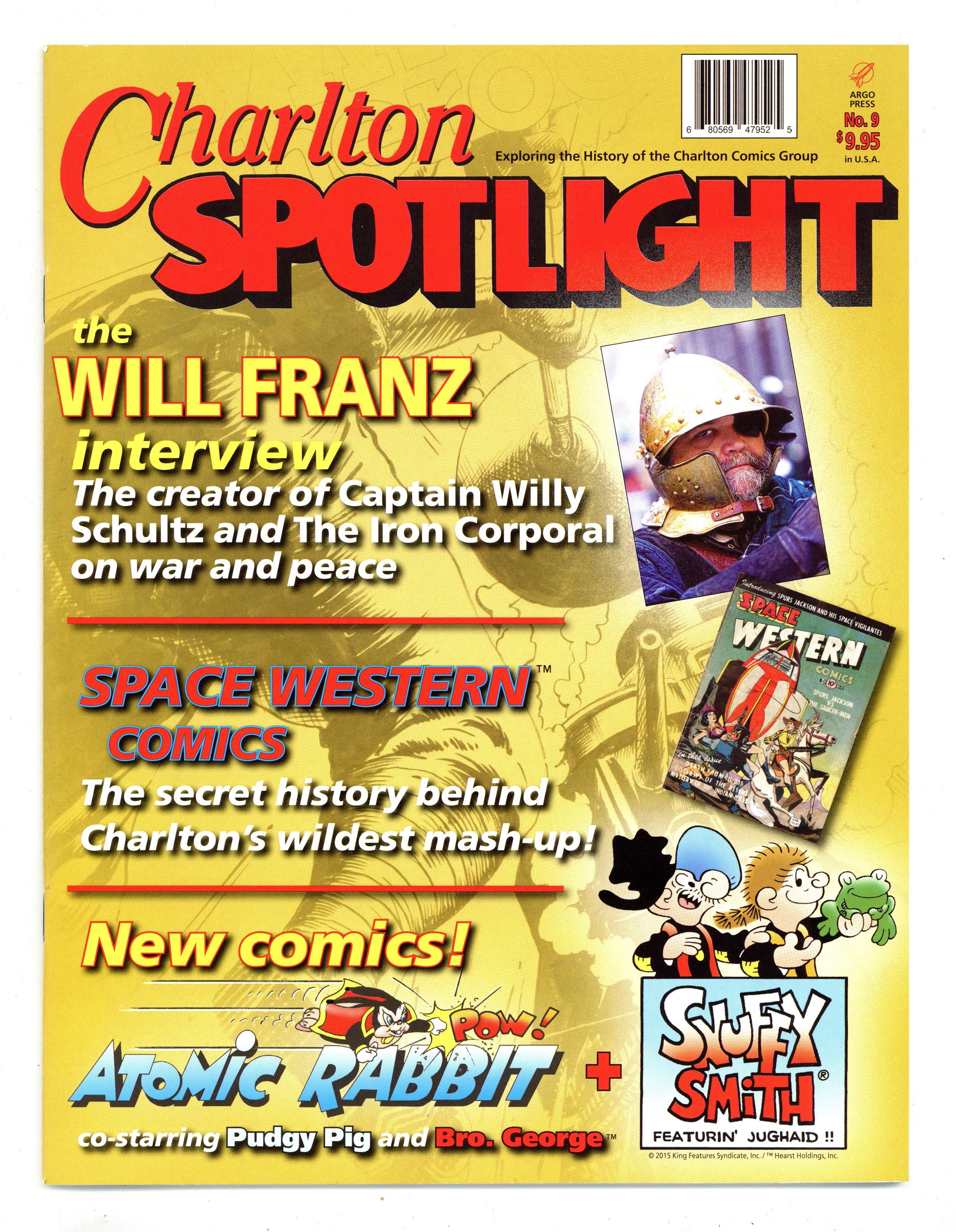 $7.00Printings may vary. Stories and art by Nicola Cuti, John Rose, Donnie Pitchford and George Wildman. Charlton Spotlight Magazine explores the history of the Charlton Comics Group. An interview with Will Franz, co-creator of The Iron Corporal and The Lonely War of Capt. Willy Schultz. A look at Charlton's whimsical 1950s mash-up comic, Space Western. Plus a Snuffy Smith strip by John Rose, a new Atomic Rabbit strip, and long-lost Weird Kids cartoons by Nicola Cuti. 8 1/2-in. x 11-in., PC/PB&W, 60 pages. Cover price $9.95.