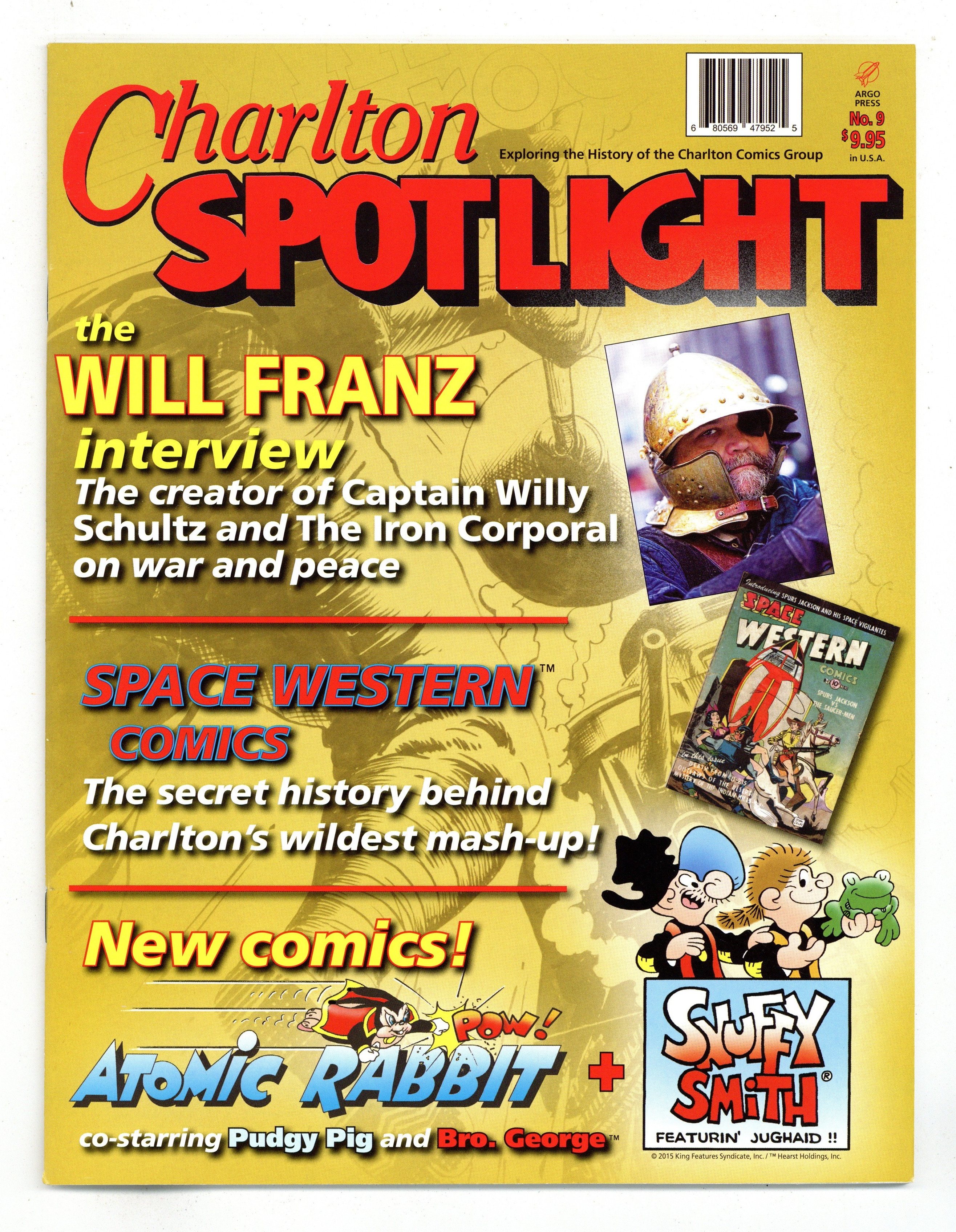 $4.60Printings may vary. Stories and art by Nicola Cuti, John Rose, Donnie Pitchford and George Wildman. Charlton Spotlight Magazine explores the history of the Charlton Comics Group. An interview with Will Franz, co-creator of The Iron Corporal and The Lonely War of Capt. Willy Schultz. A look at Charlton's whimsical 1950s mash-up comic, Space Western. Plus a Snuffy Smith strip by John Rose, a new Atomic Rabbit strip, and long-lost Weird Kids cartoons by Nicola Cuti. 8 1/2-in. x 11-in., PC/PB&W, 60 pages. Cover price $9.95.