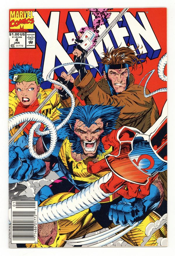 Newsstand Edition. Cover pencils by Jim Lee, inks by Scott Williams. The Resurrection and the Flesh, script by Jim Lee (Plot) and John Byrne, pencils by Jim Lee, inks by Scott Williams. First appearance of Omega Red! The Hand brings Omega Red (formerly Arkady) back to life; The X-Men play basketball, mutant style; Moira agonizes over her part in the Magneto fiasco and leaves; Gambit and Rogue are on the way to a chaperoned date when Omega Red and the Hand interfere. Cover price $1.00.