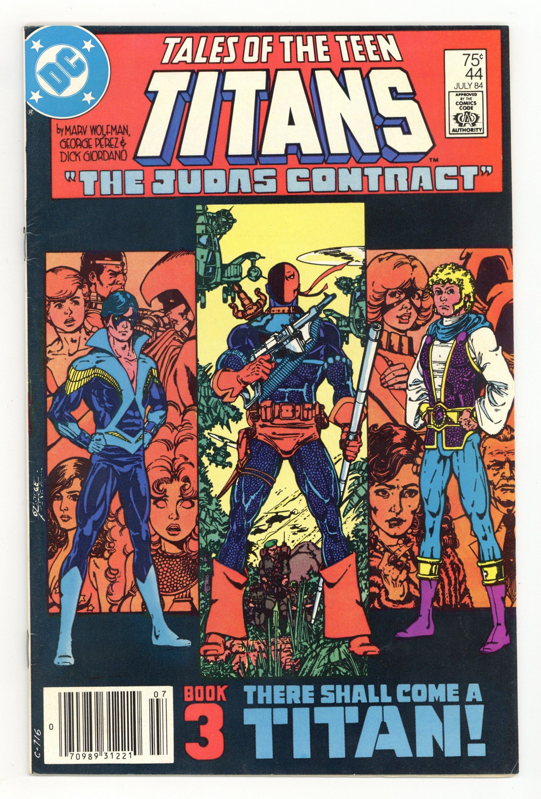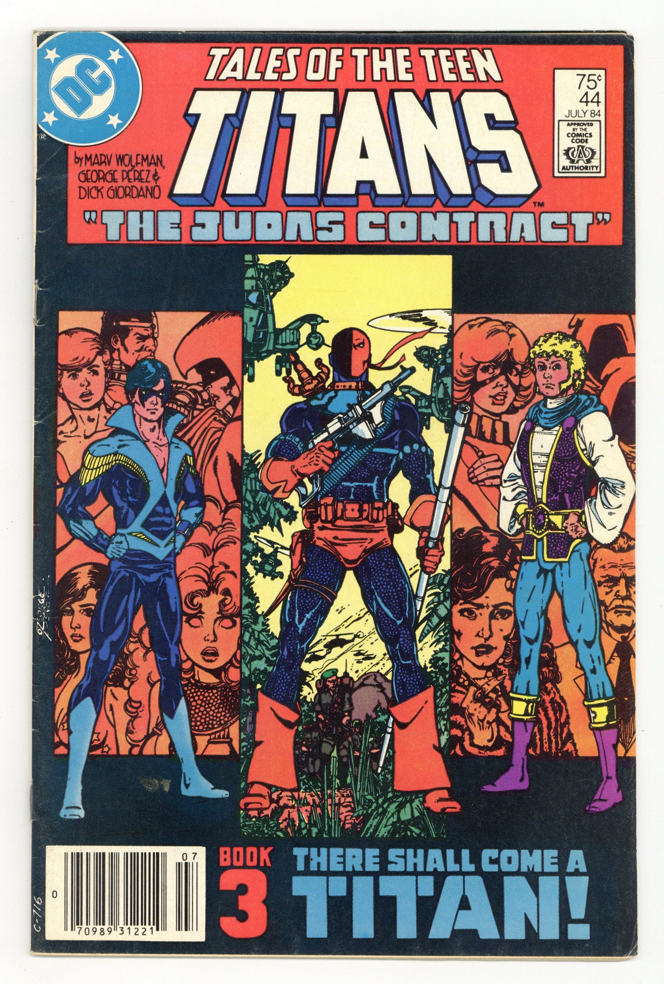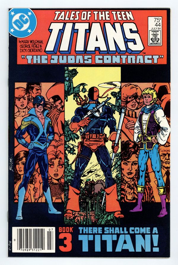 Newsstand Edition. The Judas Contract: Part 3 of 4: There Shall Come a Titan! - Written by Marv Wolfman & George Perez. Art by George Perez, Dick Giordano and Mike DeCarlo. Cover by George Perez. Adeline Wilson tells Dick Grayson of the origin of Deathstroke, and Dick assumes the name Nightwing for the first time! Starring Nightwing (intro), Jericho (intro), Deathstroke the Terminator, Terra, Adeline Wilson, H.I.V.E., Wintergreen, Grant Wilson (flashback/cameo) and Jackal. Concludes in New Teen Titans (1980) Annual #3. 36 pages, full color. Cover price $0.75.
